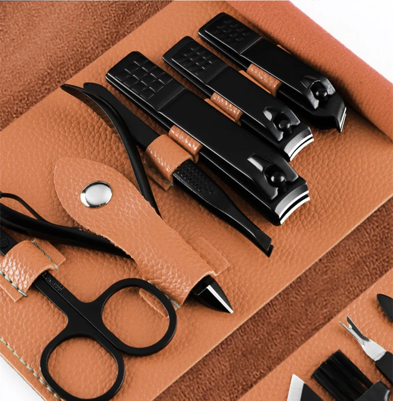 - Includes: 1x big nail clippers, 1x nail clippers, 1x diagonal pliers, 1x brush, 1x dead skin pliers, 1x toothed scraper, 1x flat mouth knife, 1x oblique knife, 1x A pick, 1x off knife, 1x dead skin fork, 1x nail file, 1x eyebrow scissors, 1x eyebrow clip, 1x acne needle