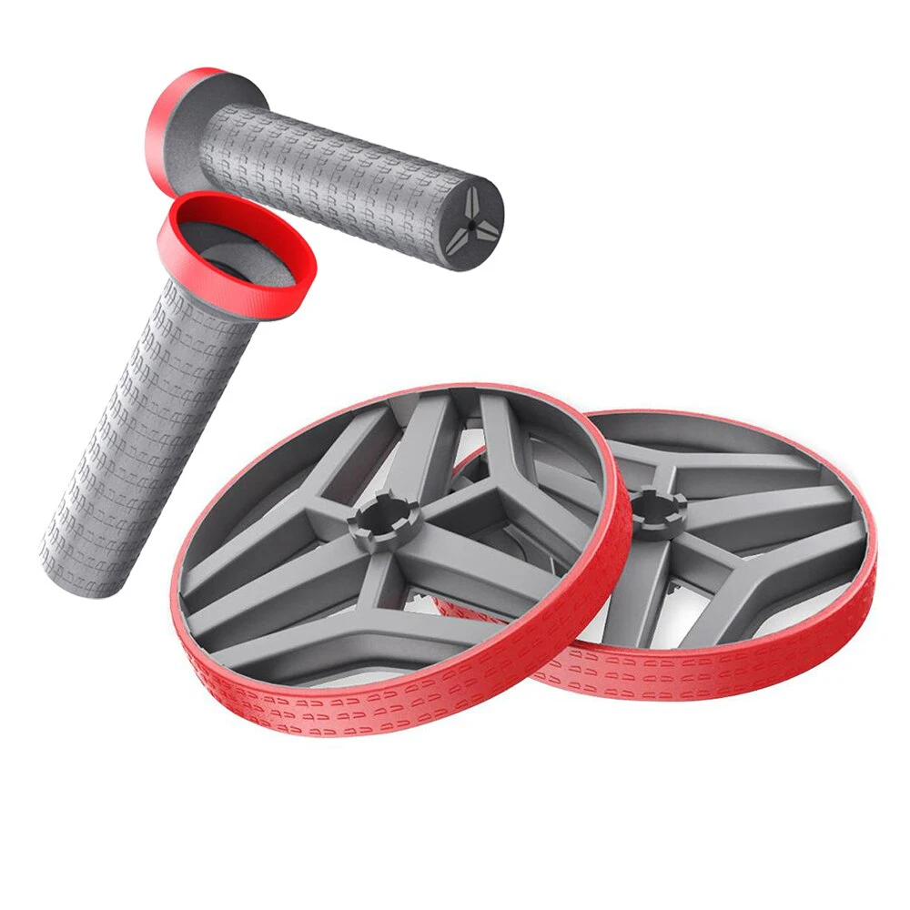 Perfect for at-home workouts. This ab roll wheel has double wheels for robustness. The plastic non-slip grip on the handles and the outside of the wheels ensures a safe workout, that doesn't damage floors, and the constructed thick alloy steel pipe in the interior effectively supports weight. The wheel is easily portable - made to be lightweight and easy to carry. The wheel is 18.5cm in diameter, 30cm in total length (including the handles). The handles are 2.8cm in diameter, and the wheels are each 2.4cm in width.