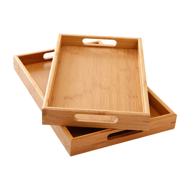 The perfect tray for serving platters, baking or tea and coffee. Made of bamboo, the tray is an authentic bamboo color and has a smooth, glossy finish. Outside of the kitchen, this tray is great for adding earthy textures to your home decor, storing loose ends, showing off your jewelry or even for placing documents in your office. Available in a flat tray or one with sides and handles. Different sizes are also available.