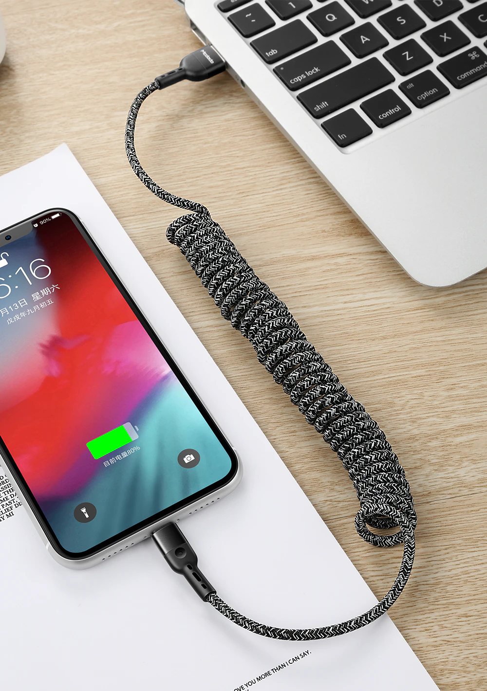 You dont need to worry about chords getting draped across your room just to charge your phone while you use it. This braided coil USB cable gives you the option to stretch it out when you need to, or retract it when your phone is staying near the plug. With reinforced connector design, bending the end of the chord will not break it.