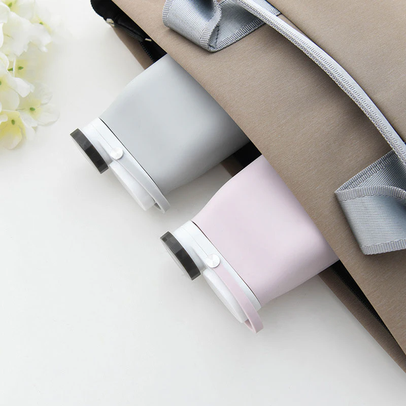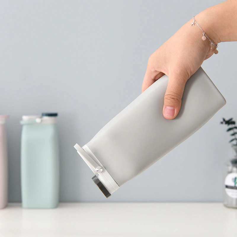 Made of food-grade silicone, with a collapsible, foldable and lightweight design, this bottle is ideal for taking to work, keeping on your bedside table, or taking to the gym. An elastic handle is at the top of the bottle for easy portability when the bottle is in use, and also wraps around the bottom of the bottle when it is folded to keep it compact. The bottle's capacity is 600ml. The mouth piece of the bottle is a bottle cap design, screwing to fasten.
