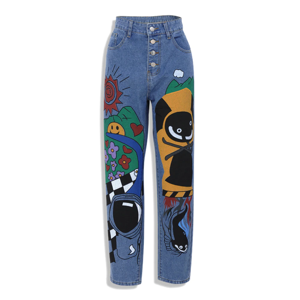 Painted jeans are on trend right now, don't miss it with these comic sketch print jeans! These jeans have a mom-jean style fit, which means they flatter a wide range of body types. Featuring fun patterns and bright colours, show off your fearless fashion with the cartoon print on jeans.