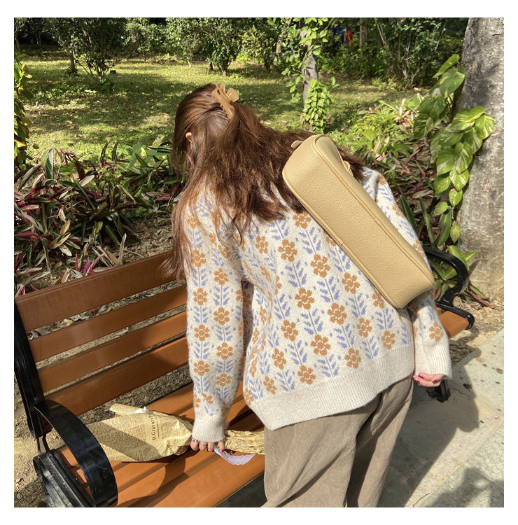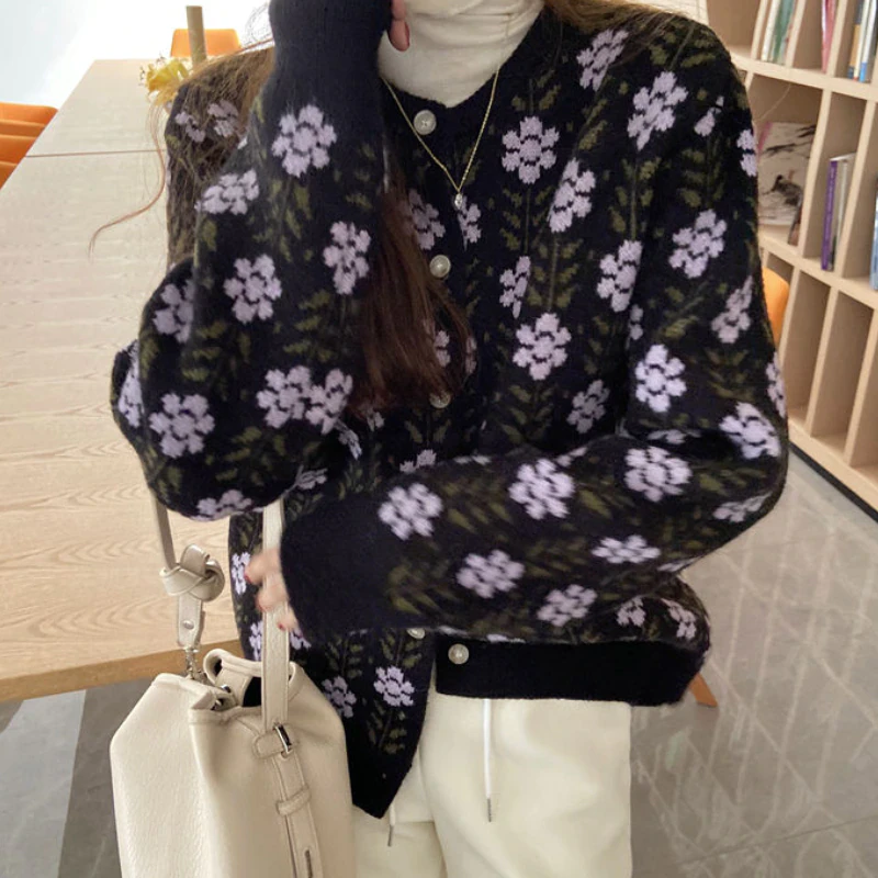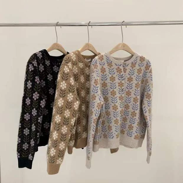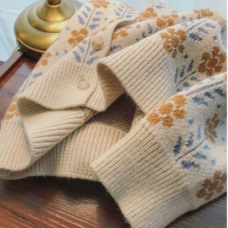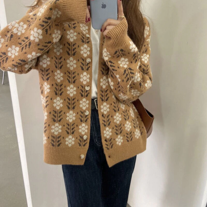 Keep cozy in this chic knitted sweater. Your new favourite go-to on a chilly day, this cotton cardigan features a vintage inspired floral print and is available in a range of colours and sizes so you can find the perfect fit for your wardrobe.