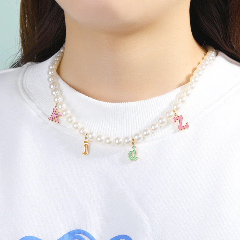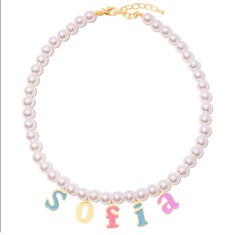 This gorgeous pendant pearl necklace can be customised with your name or initials so you can make it a one of a kind piece. Threaded with pearlescent beads with gold plated detailing and your chosen colourful letter pendants. A lovely gift idea for all ages.