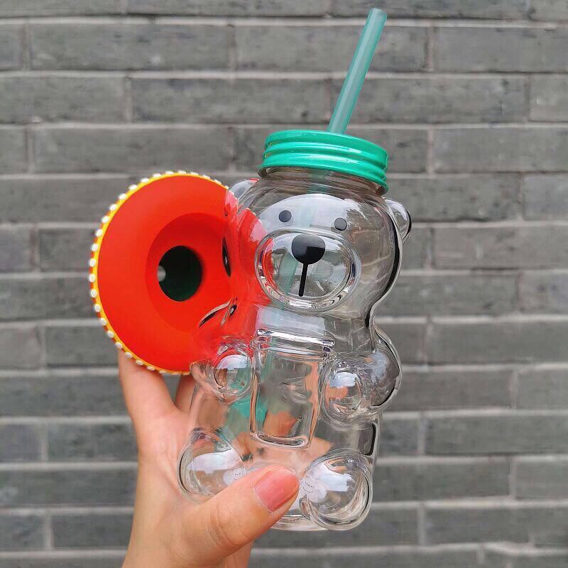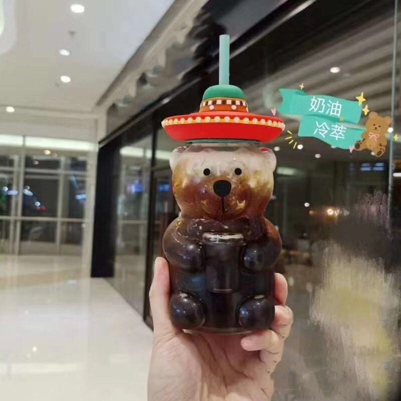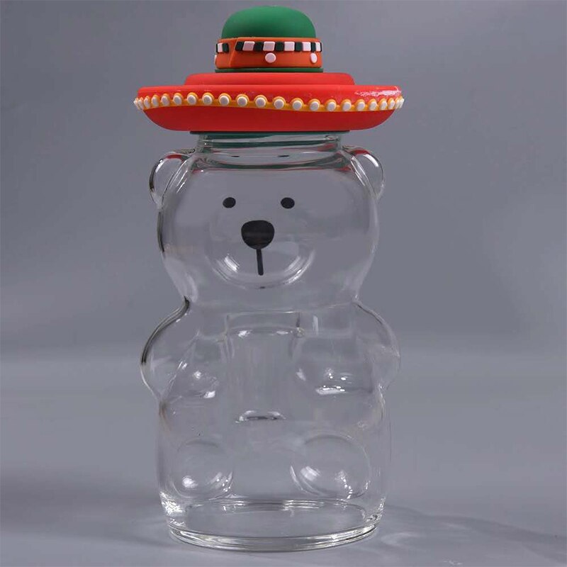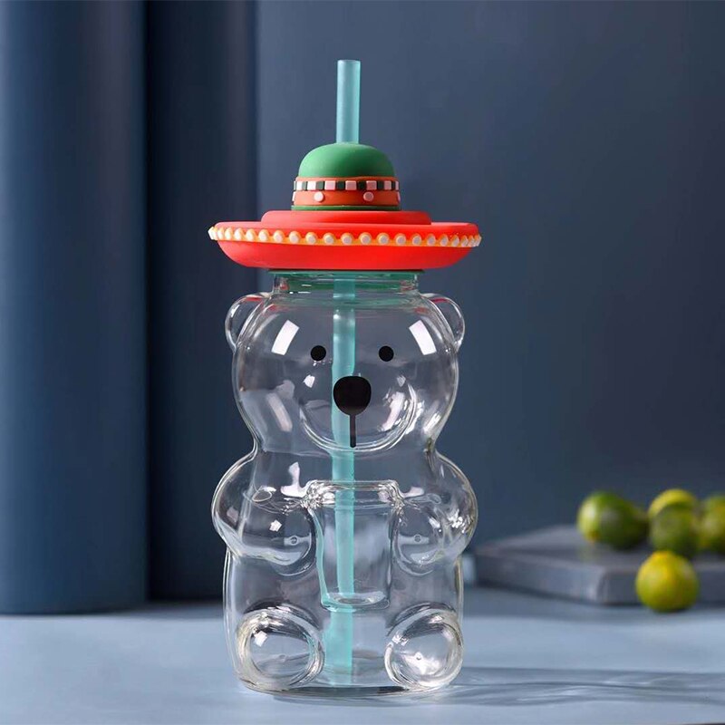 Made from transparent glass, this 500ml cup is in in the shape of a bear and features a sombrero lid with a straw.