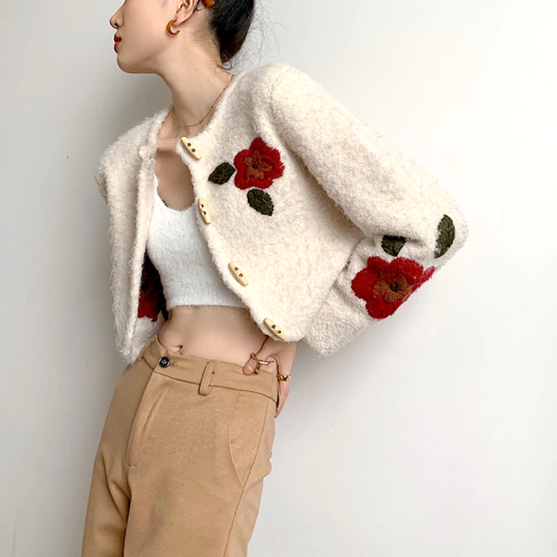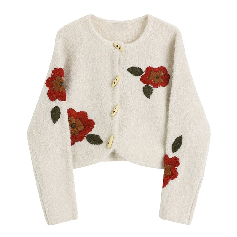 Cozy up next to the fire with a hot cup of tea, your favorite book, and this gorgeous vintage inspired cardigan. It features a cropped silhouette and rose embroidered designs. It effortlessly blends a modern fit within a classic wool cardigan, making it the perfect winter companion for layering.