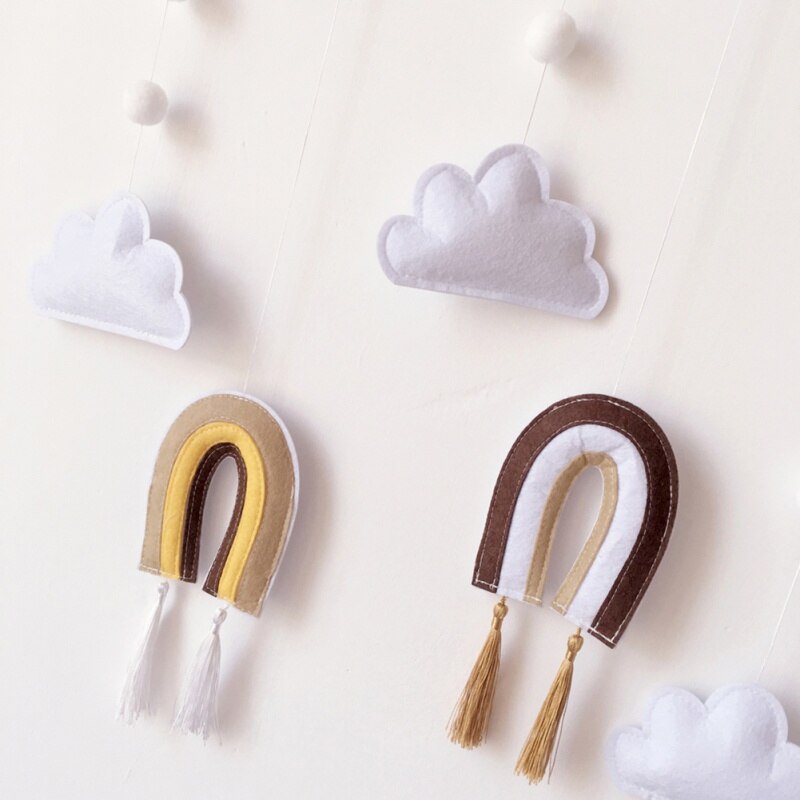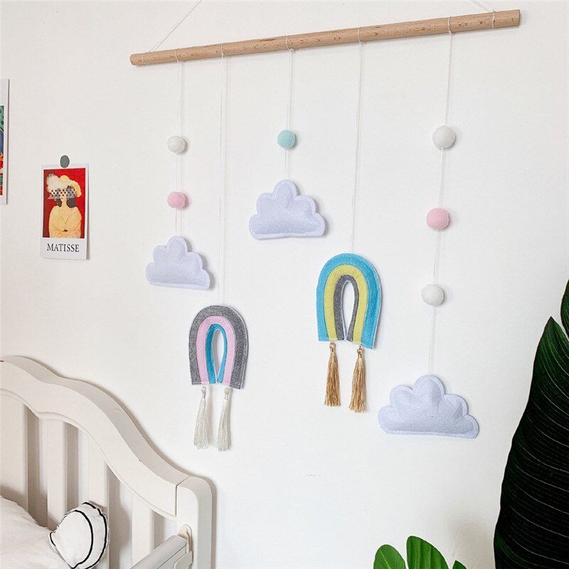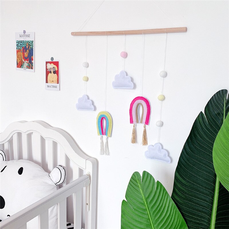 A whimsical design featuring clouds and rainbows hanging from a wooden rod that can be hung from the wall or ceiling.