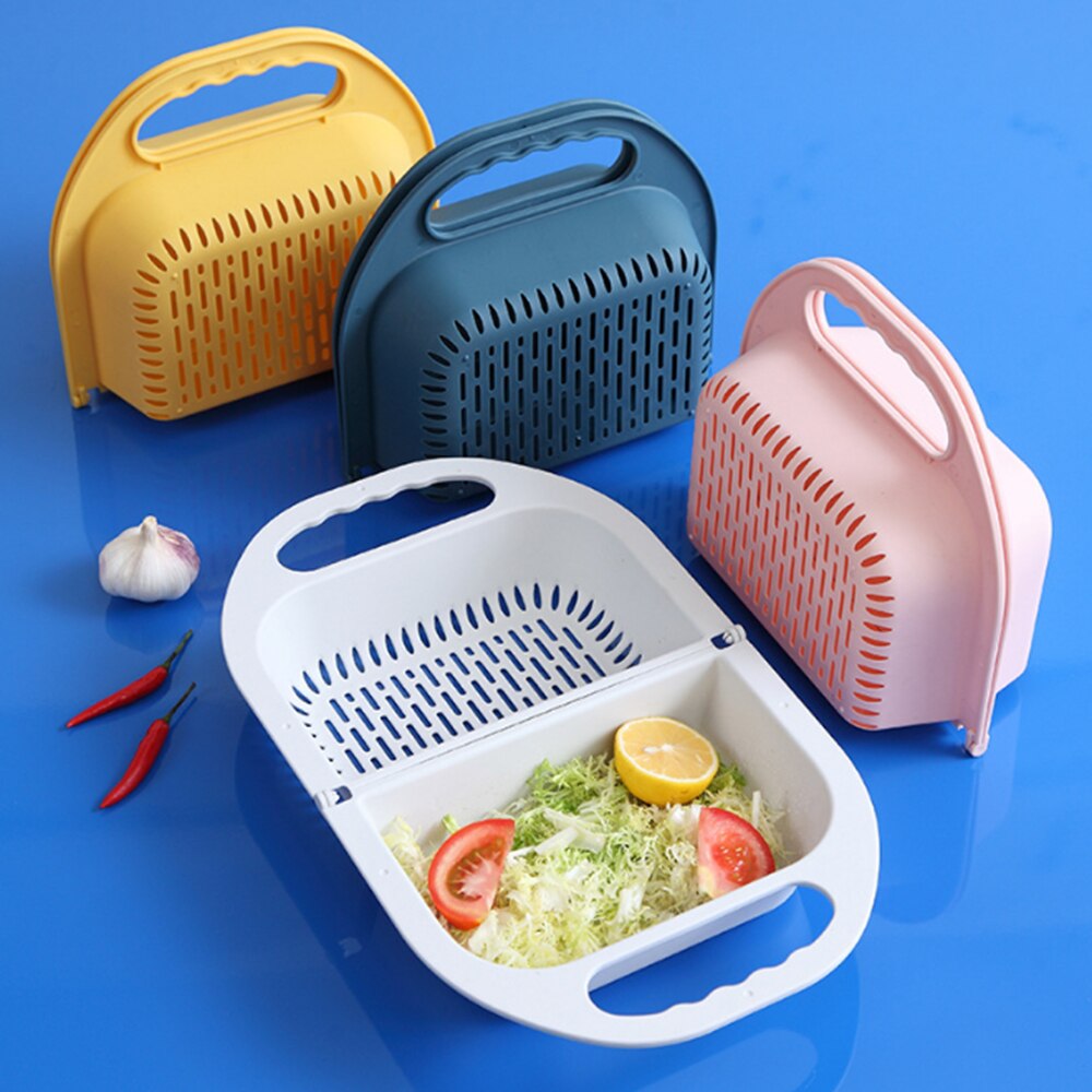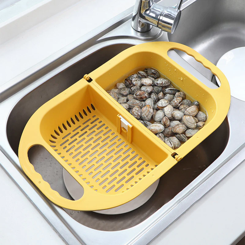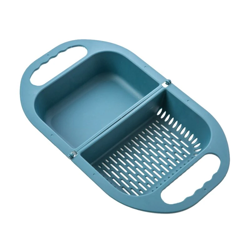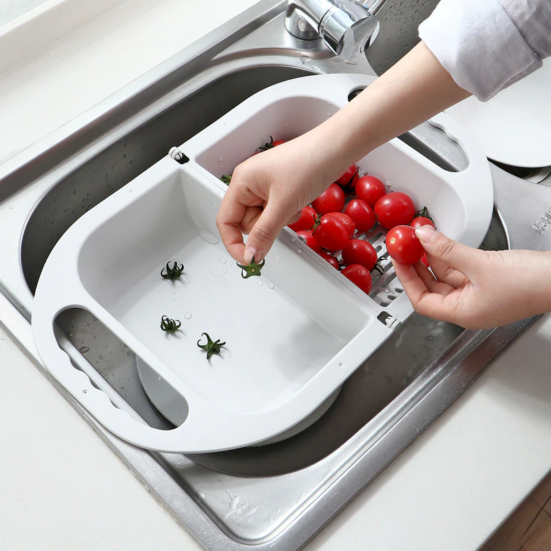 This foldable drain has a separate basket partition so you can soak and wash your vegetables and fruits at the same time. Compact and portable, it folds away like a handbag for easy storage and expands so it sits on top of the sink while draining.