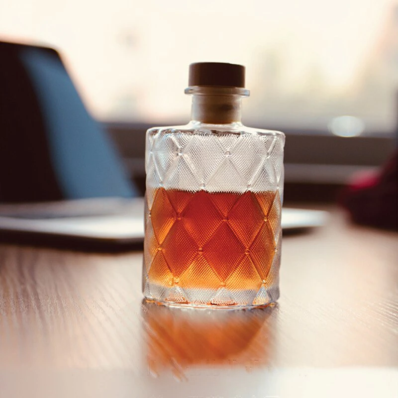 This elegant frosted glass bottle is sure to catch your eye with its unique texture. The frosted pattern adds a touch of sophistication to any space, while the natural solid wood cork style lid provides a beautiful contrast. This bottle is perfect for use as a decorative accent or as a storage container for your favorite liquids. Its simple yet stylish design makes a lovely addition to any home decor style.