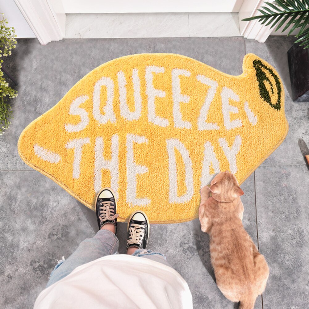 Available in a "peachy clean" peach shape, or a "squeeze the day" lemon shape, this mat made from polyester, has a non slip backing, is absorbent, and sits perfectly at the foot of your bath or shower.