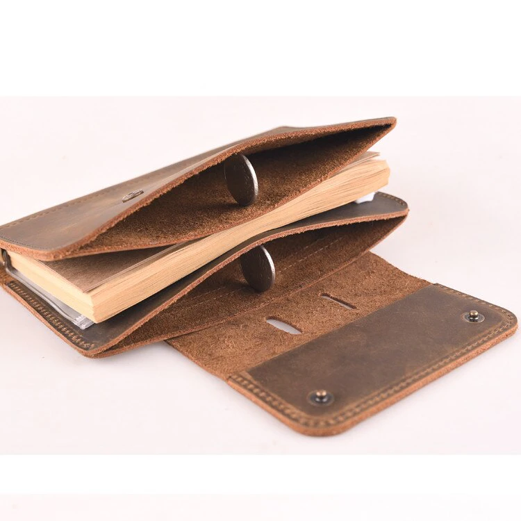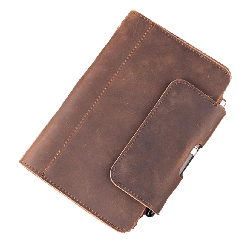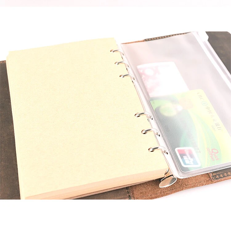 The high-quality, soft, genuine leather exterior ensures your precious notes are kept safe. Available in various colors, A6 or A5 sizes, with the choice of buying the notebook interior with the leather cover, or just the cover. The A6 interior includes 80 sheets of lined kraft paper, secured by metal spiral binding coils, a PVC file bag and a built-in pen holder. The A5 interior consists of the same, as well as two cardholders. The case secures with a clasp-snap. The pen is not included in the purchase