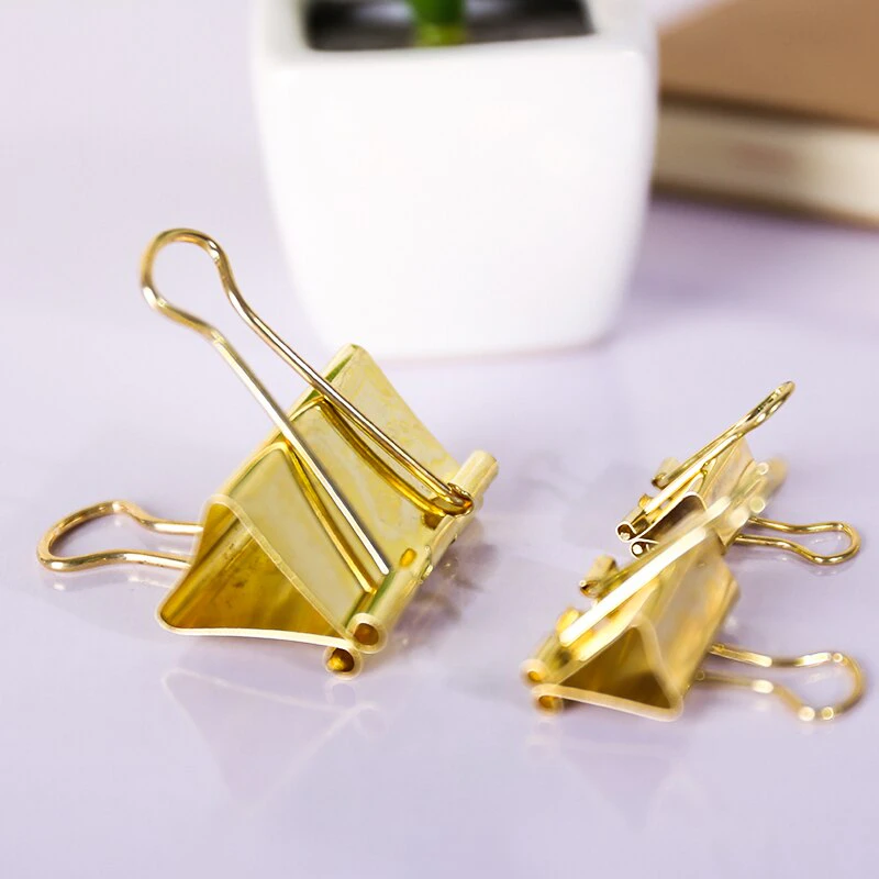 This sleek, modern set of 3 gold binder clips is perfect for your home office or workspace. Available in a range of sizes so you can choose the perfect one for your needs. The clips are made of durable metal, so they'll stand up to heavy use while the sleek gold finish adds a touch of style to your desk and paperwork.