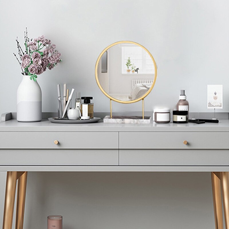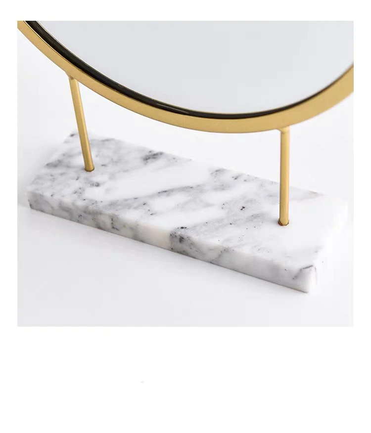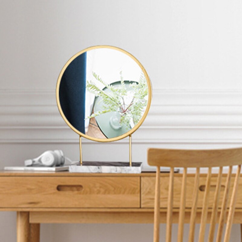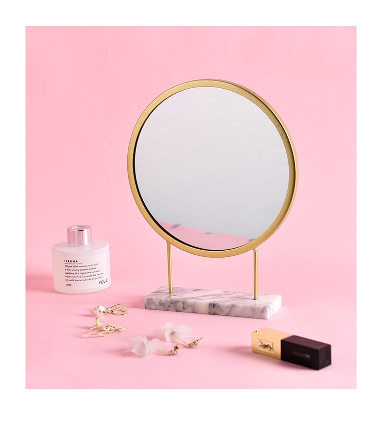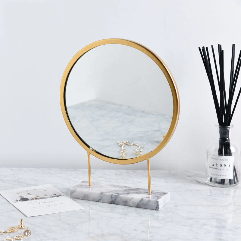 Get ready in style with this beautiful round gold mirror with a smooth marble base. The lightweight design means you can easy move it around the home, whether you want to display it as a decor piece or find the perfect lighting for applying makeup. This mirror also features a small hook on the back so it can easily be mounted on the wall and will brighten any room of the house.