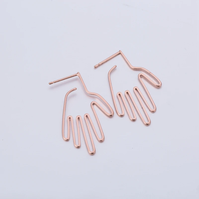 Quirky and unique, these studs are the artsy earrings you've been looking for to spice up your outfits. Designed creatively to show an outline of a palm. Made of copper, the earrings are nickel-free, as well as being hypoallergenic. The gold coloring is classy and elegant and, if you prefer, silver and rose gold are also available, to suit you. The earrings have a stud design, attached at the top of the palm so that the earrings hang nicely with the design clearly visible. An easy but unique present for a loved one, that stands out from the rest.
