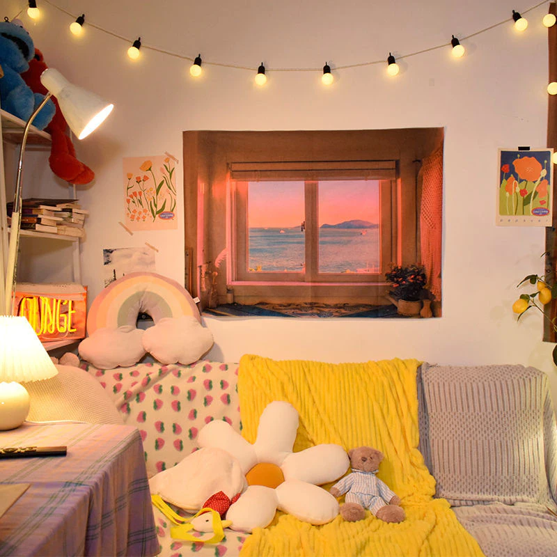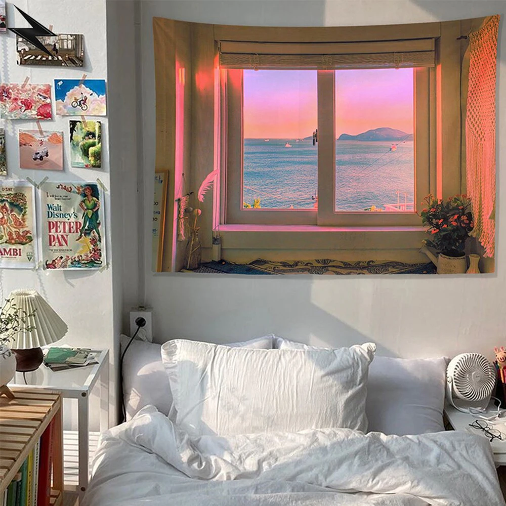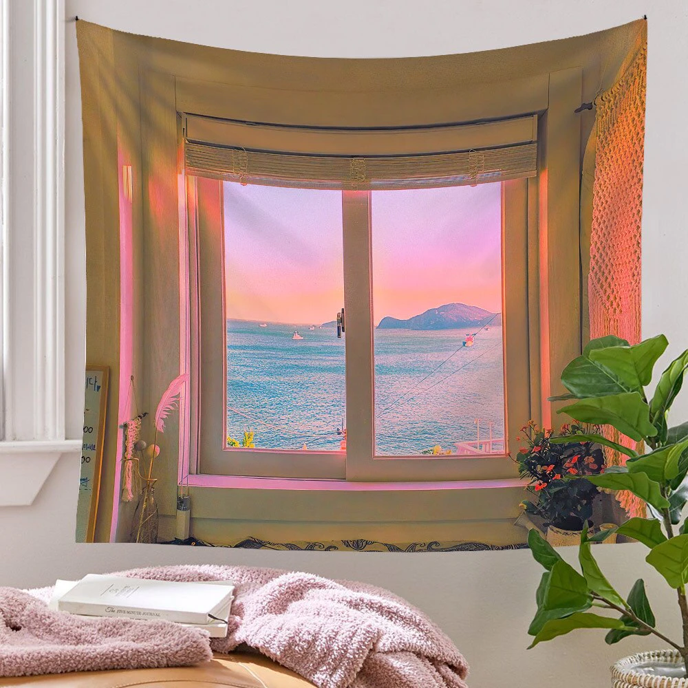 Tired of staring at the same view every day? This gorgeous tapestry features a window looking out on the sunset over the sea, so you can enjoy paradise from the comfort of your own home no matter where you are in the world. Hang this tapestry on your wall & enjoy the glow of golden hour every hour.