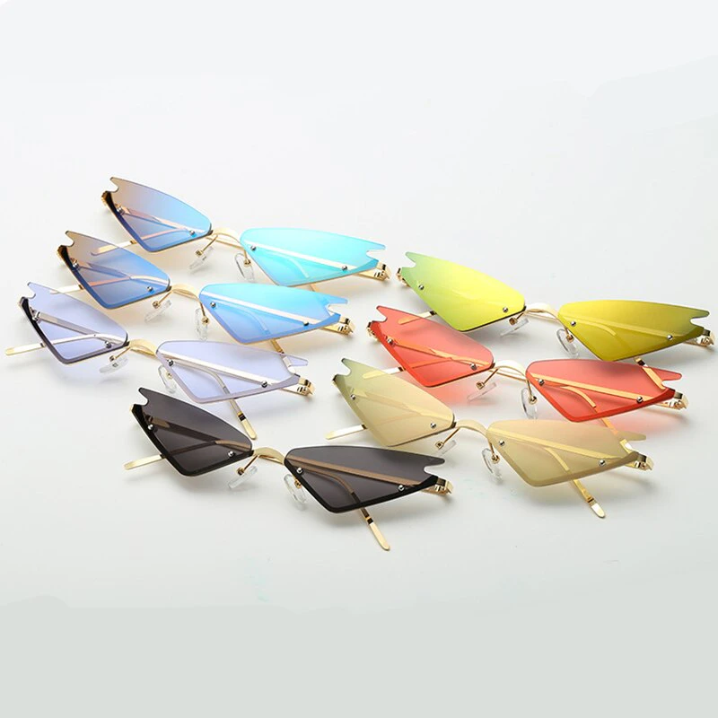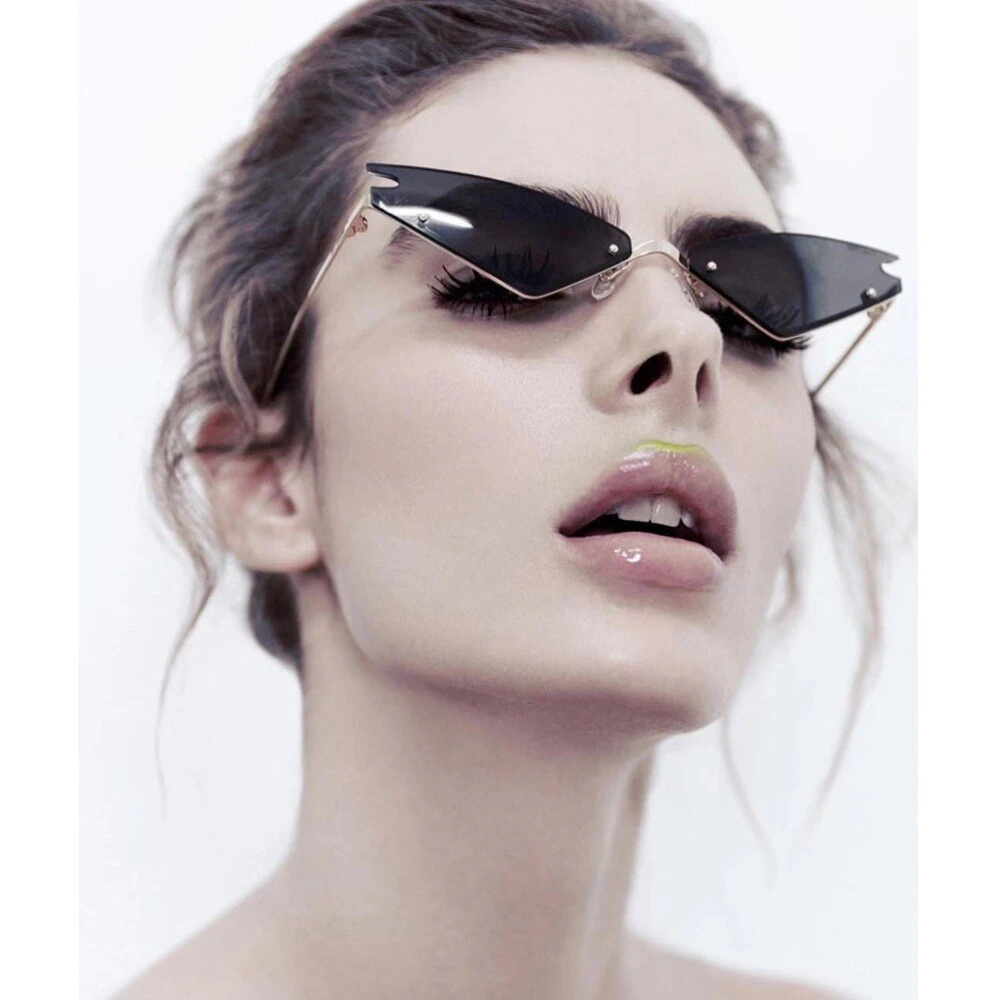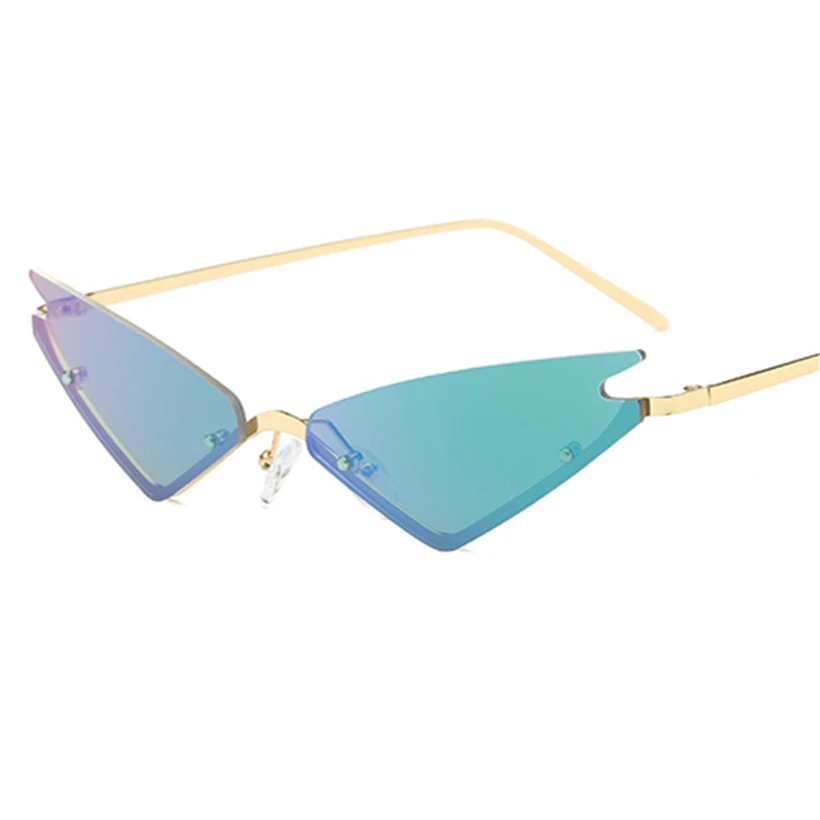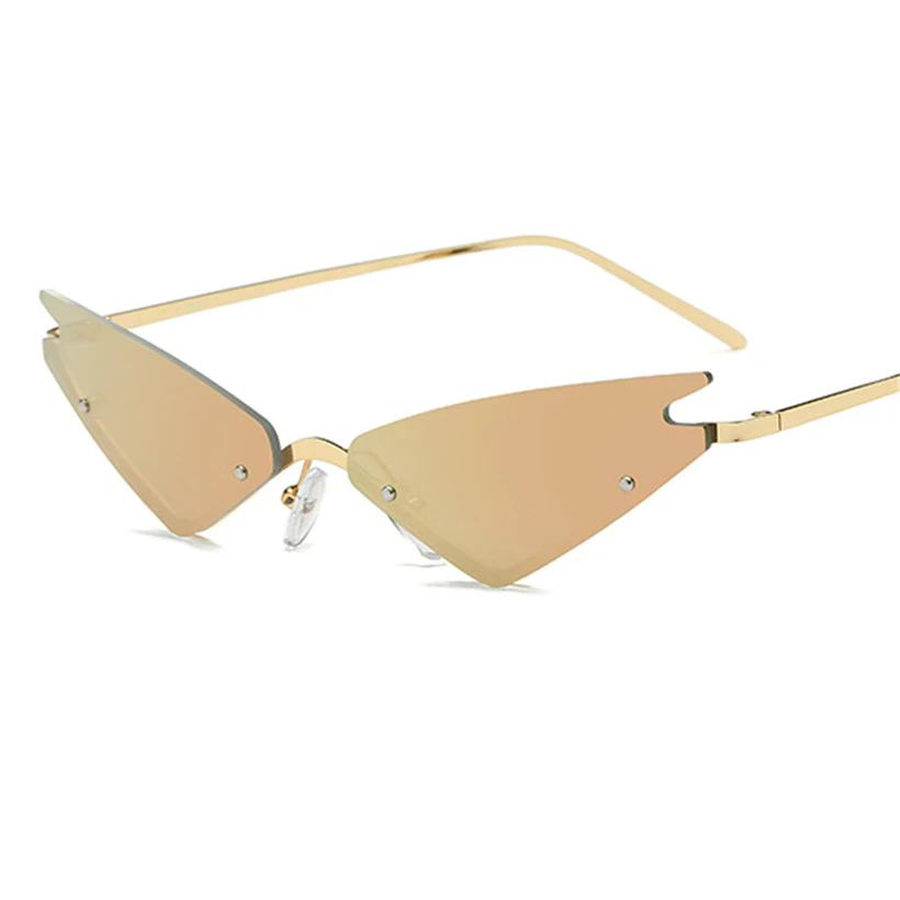 A unique take on the trendy cat-eye look. The colored, transparent lenses, rated UV400 and made of polycarbonate, and the gold metal temples add style to these glasses. The alloy frame is constructed to withstand day-to-day wear. The temples are 13.6cm long, and the front-on width of the glasses is 14.1cm. Available in several colors.