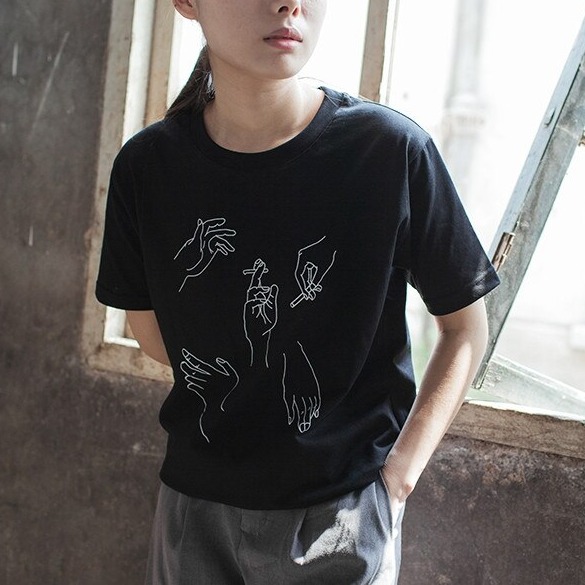 Crafted from a blend of nylon, cotton, and spandex, this tee is not just comfortable, but also stylish with a minimalist black line hands print on the front. Available in a range of sizes, this tee is a great fit for everyone. Whether you dress it up or dress it down, this tee is a versatile addition to any wardrobe.