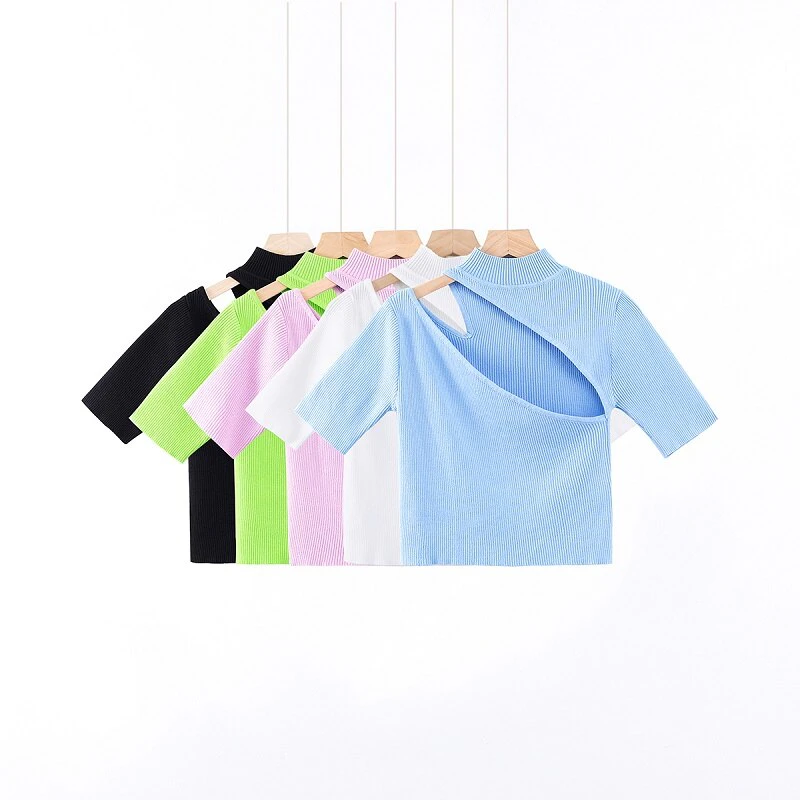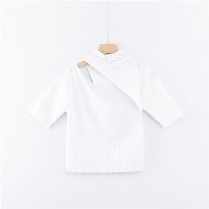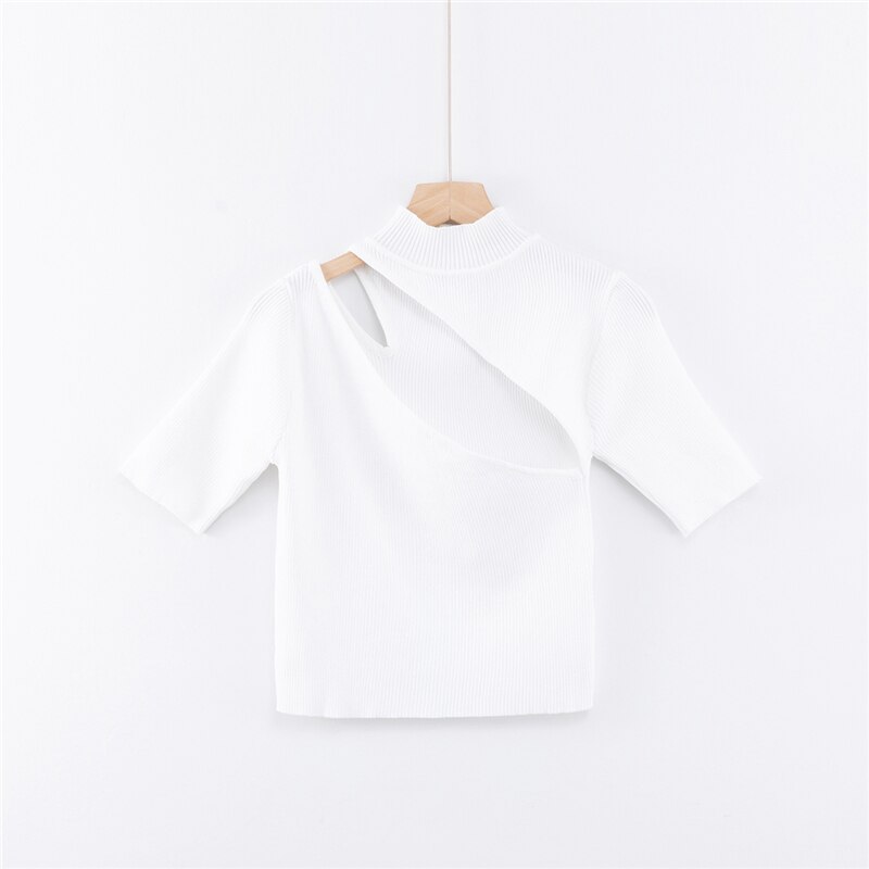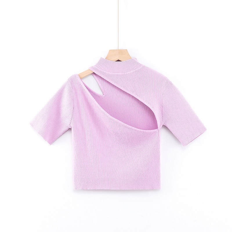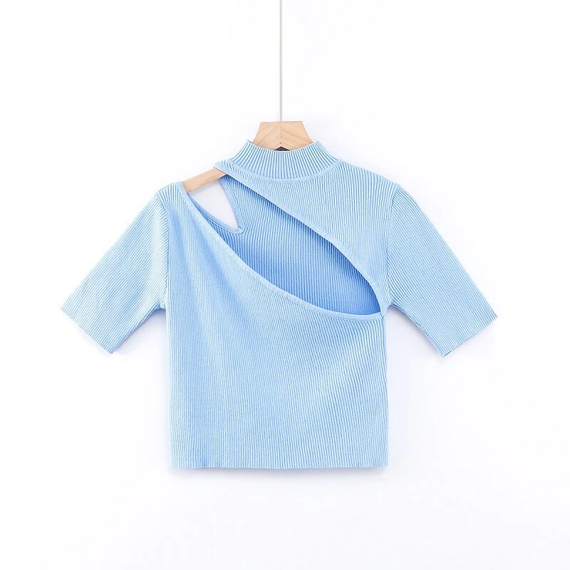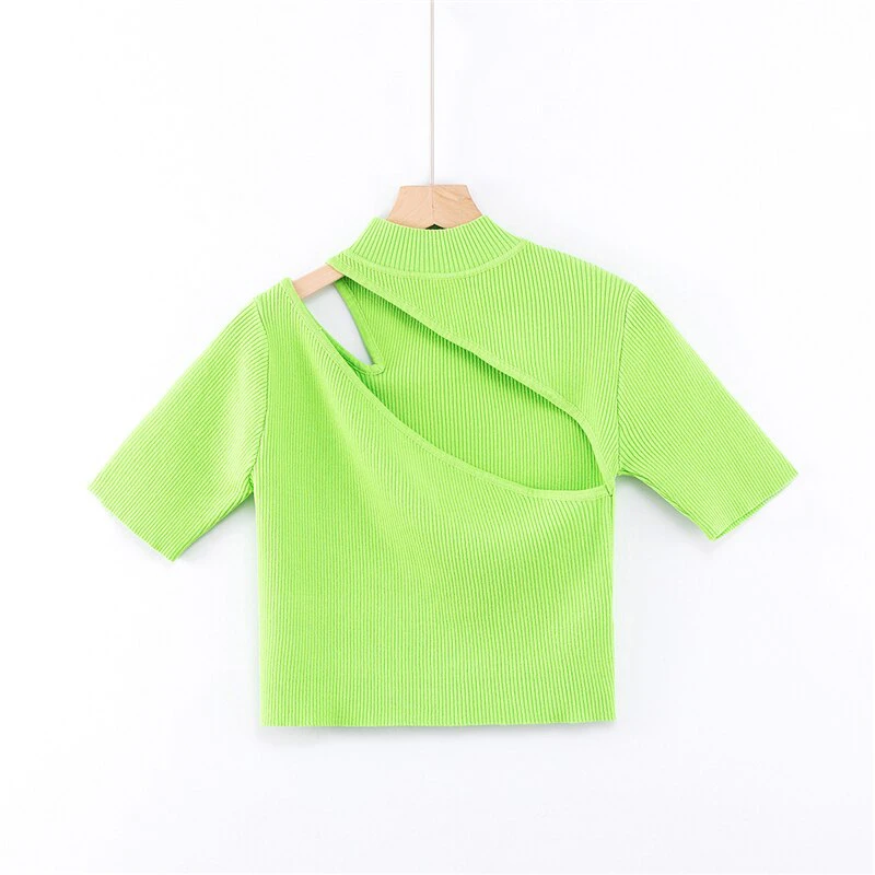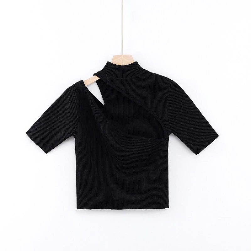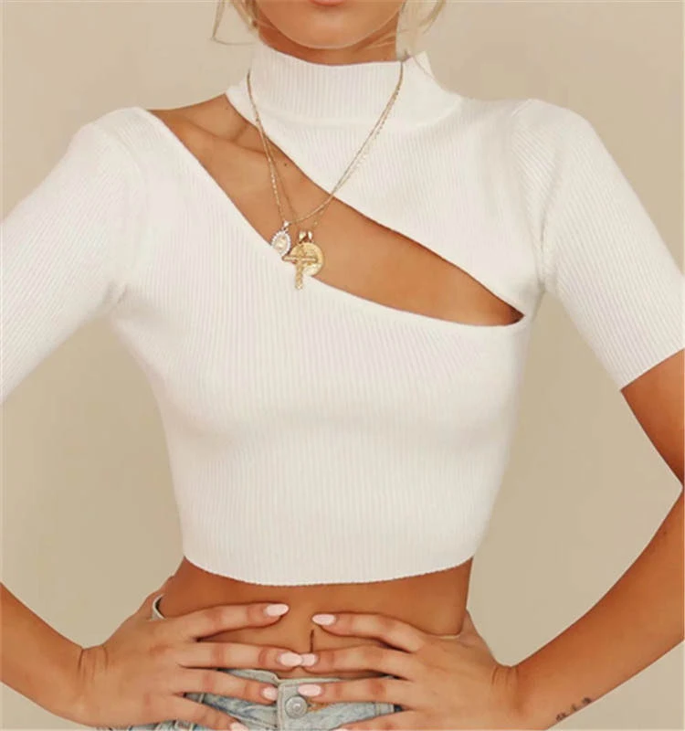 A stylish statement piece to make you stand out in the crowd, this high neck ribbed top features an asymmetrical cut out over the shoulder and a cropped length.