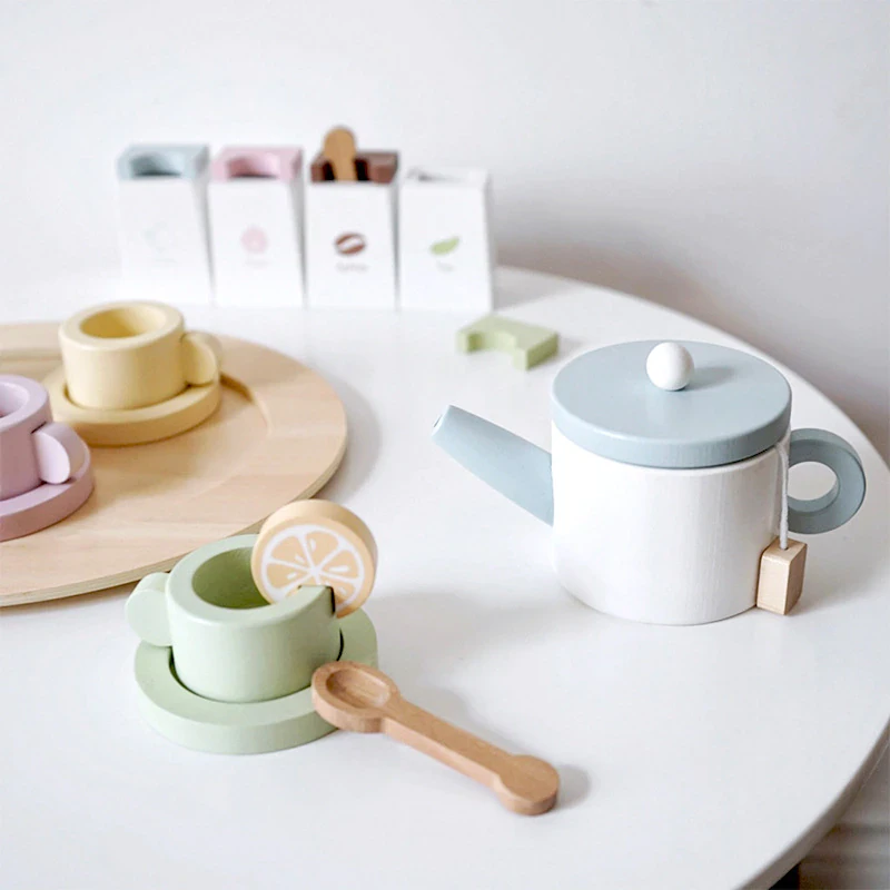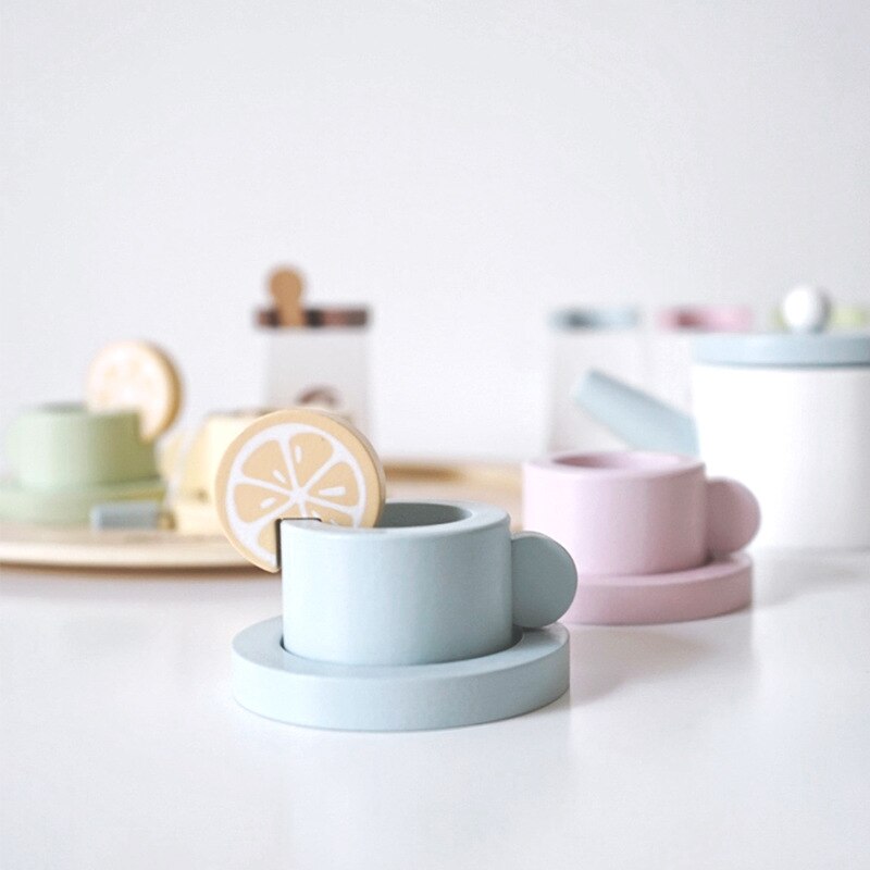 Add to your child's home-play corner with this pastel coloured wooden tea set.