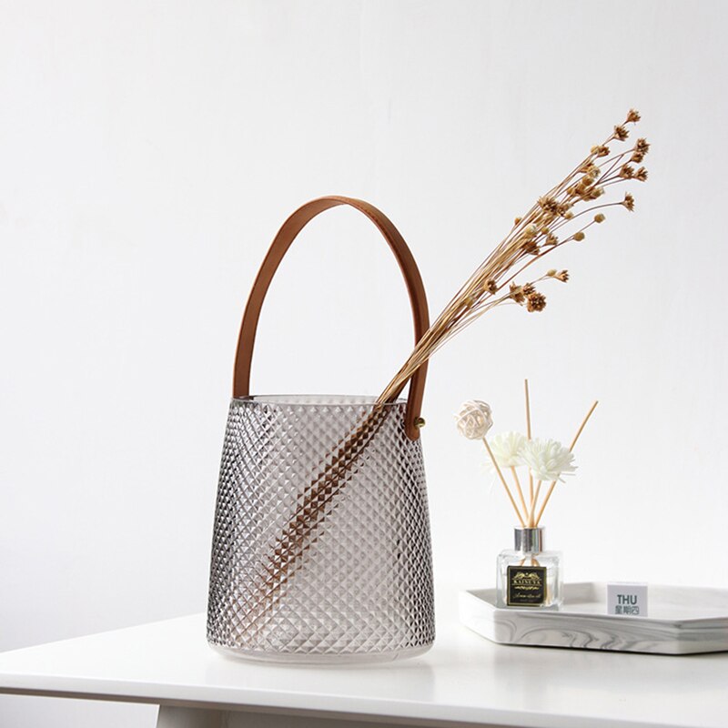 Showcase your fresh flowers or plant cuttings in this lovely glass vase featuring a faux leather handle.