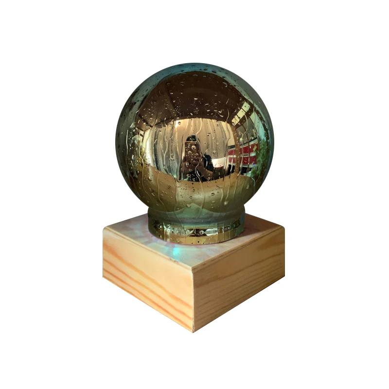Whether it's on or off this unique lamp makes an eye catching decor piece with it's rain-like texture and multi-coloured lamp on top of a smooth wooden base.