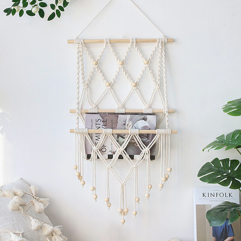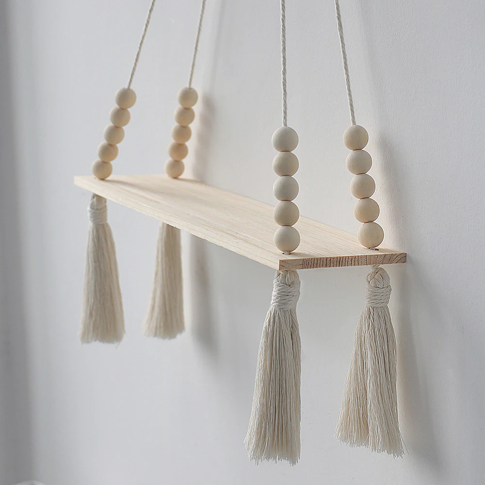 Add some functional yet stylish decor to your walls with these hanging macrame shelves. With a wooden platform and a variety of macrame details, add an extra touch of texture and warmth into your home. Strings are adjustable allowing you to customise the hanging height to match your needs.