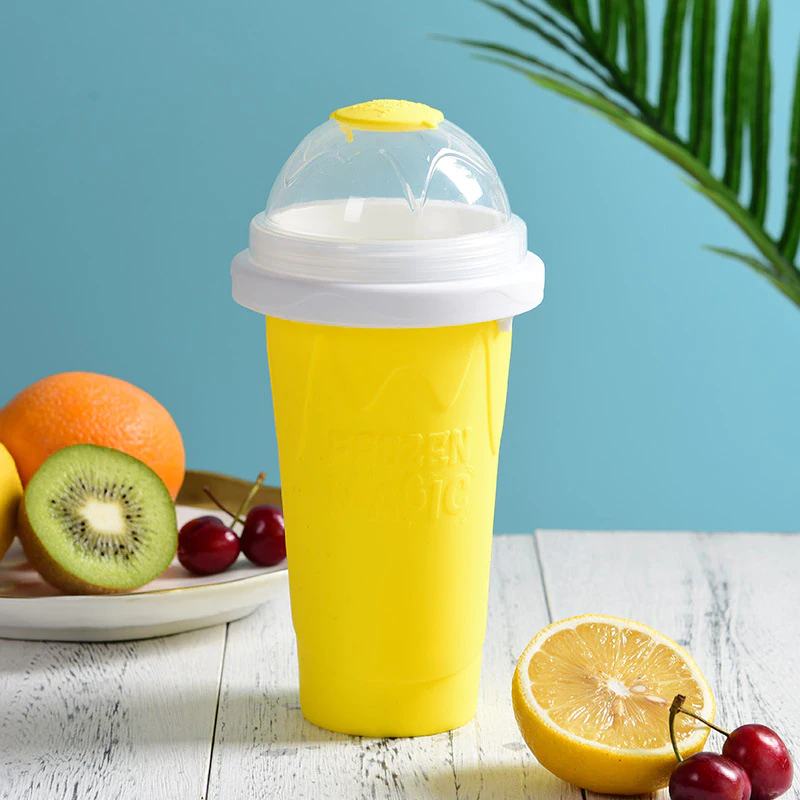 All you have to do is put the cup in the freezer, wait for it to freeze then add your preferred chilled drink and squeeze! No ice, no blenders, no mess. Whether you feel like a slushy juice, chocolate milk or soda, just freeze, squeeze and enjoy!