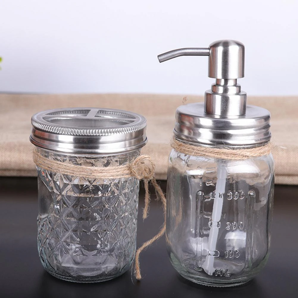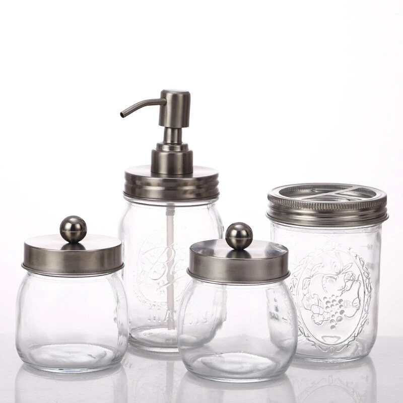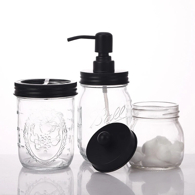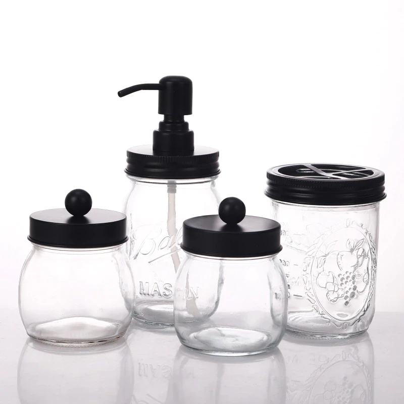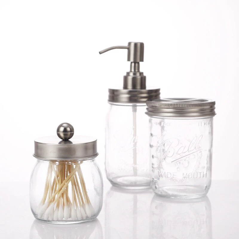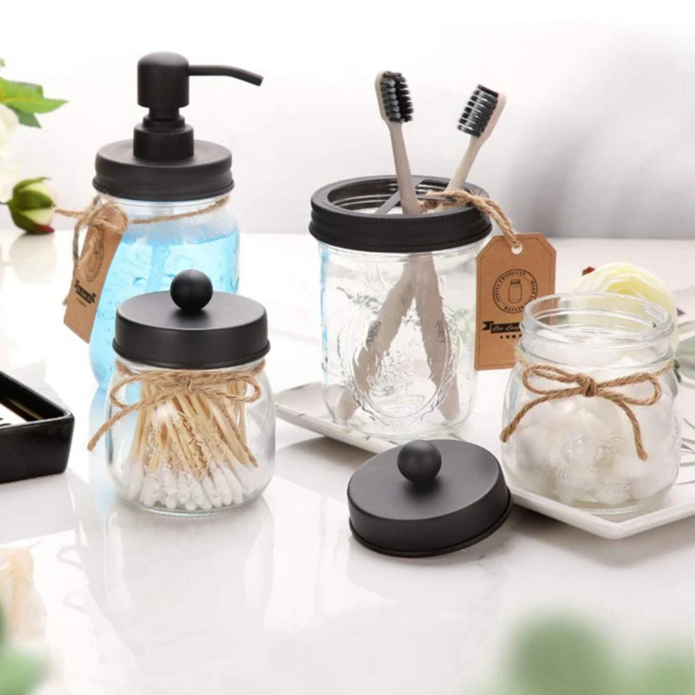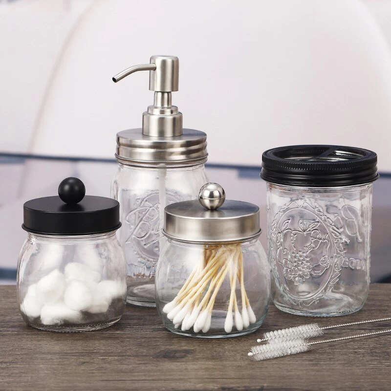 Who said bathrooms have to be boring? Decorate your bathroom with this set of mason jar bathroom accessories. Consisting of four pieces; a soap dispenser, a toothbrush holder with inbuilt divider, and two small jars with lids. These jars are so versatile, you can choose what you put in them.