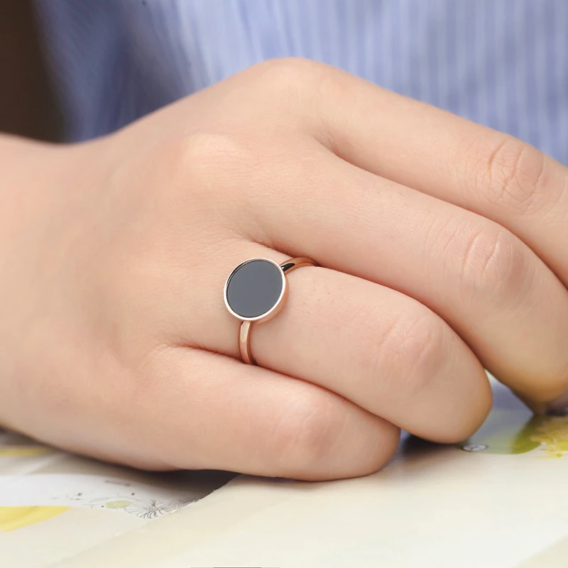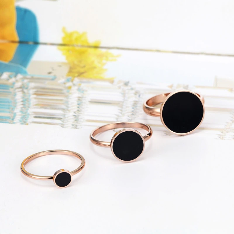 This stunning rose gold ring boasts a minimalistic design that is both timeless and elegant. Crafted from premium titanium steel, this piece exudes durability and sophistication. The black acrylic centre stone adds a pop of contrast to the overall look, making it a versatile accessory that can be paired with any outfit.