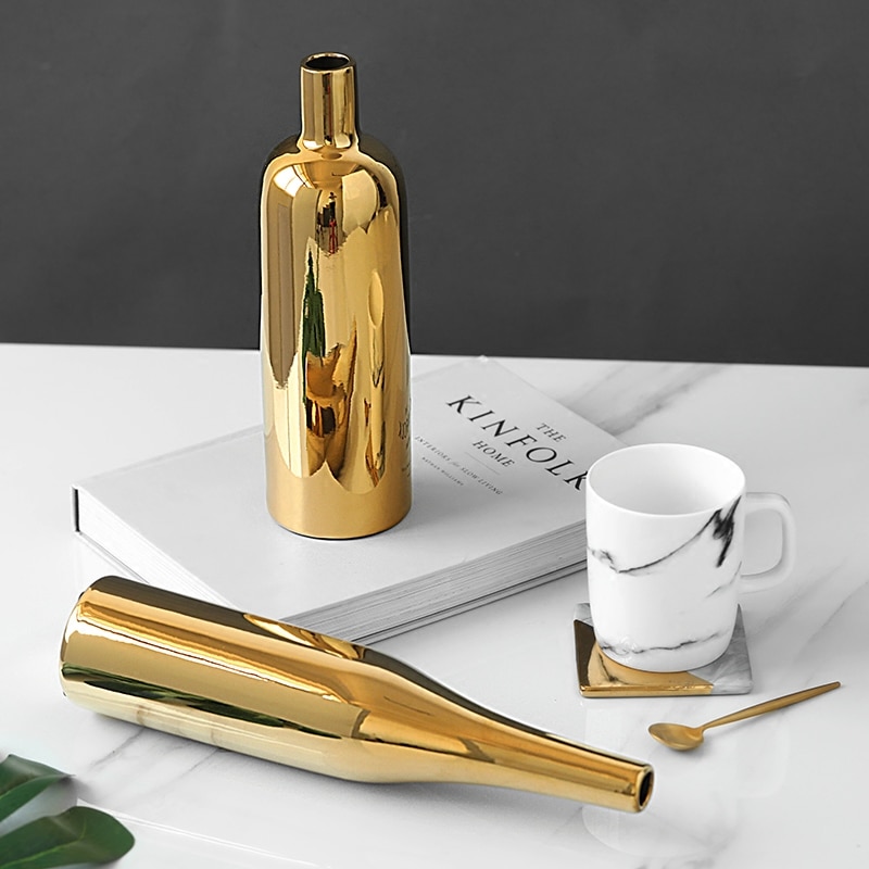 Add a touch of elegance to your home with this minimalist gold ceramic vase. Crafted from high-quality ceramic material and finished with a luxurious gold plating, this vase exudes sophistication and style. Whether you choose the small, medium, or large size option, this vase is perfect for displaying your favorite florals or simply as a standalone decoration on your shelves or tables. The versatile and timeless design of this vase makes it a perfect addition to any home decor style. Elevate your space with this stunning gold ceramic vase today.