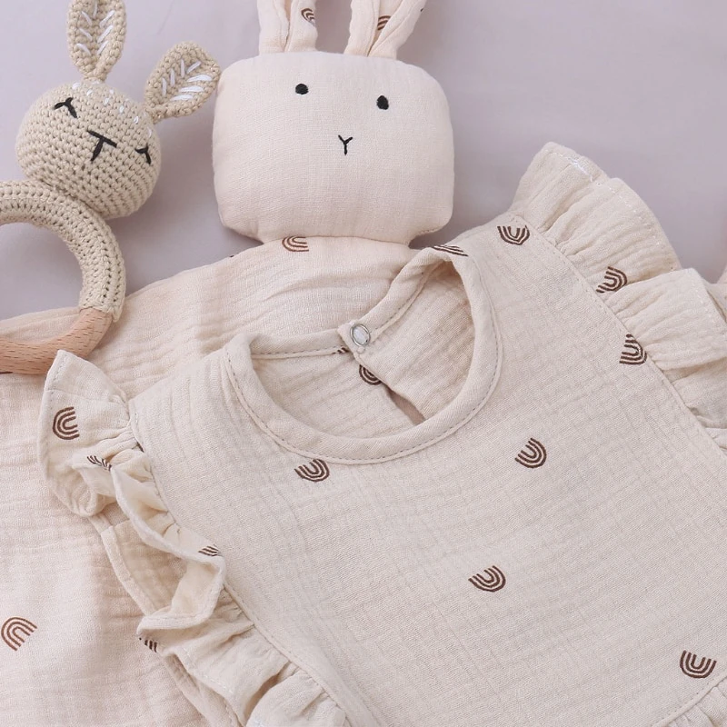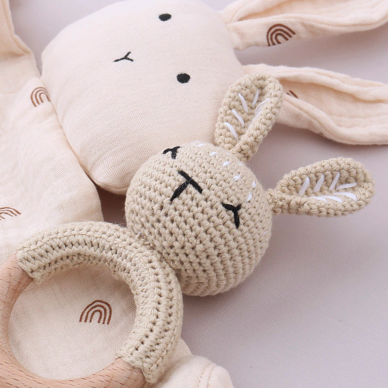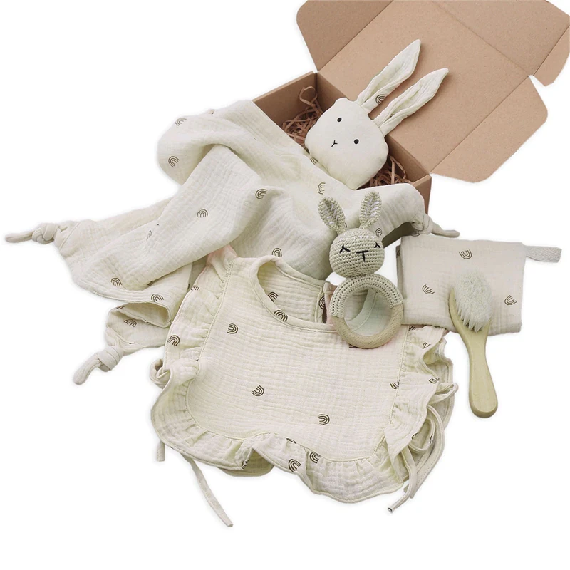 Each set has a unique theme with various patterns, colours, and items. The set includes a bib, snuggly blanket, teething rattle, soft hair brush and a face cloth.