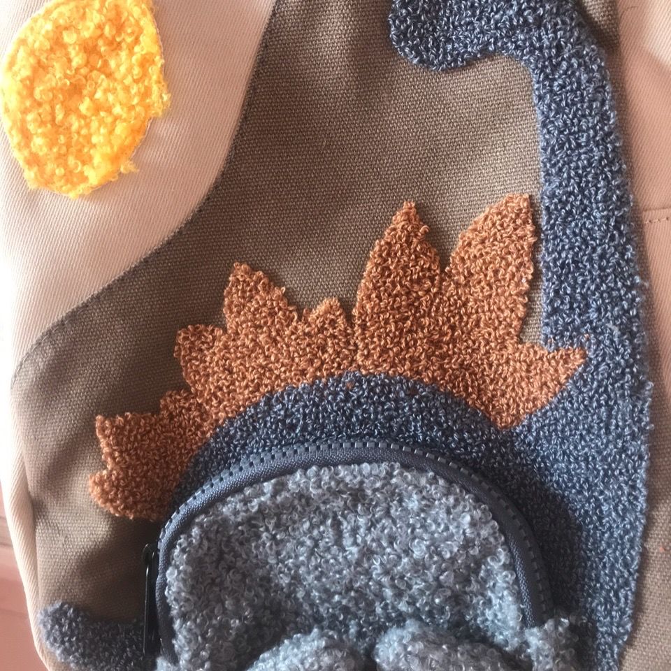 Made from lightweight canvas and polyester with a fun textured dinosaur design on the front, a large main pocket and small front pocket, both with zip closures to keep everything secure.