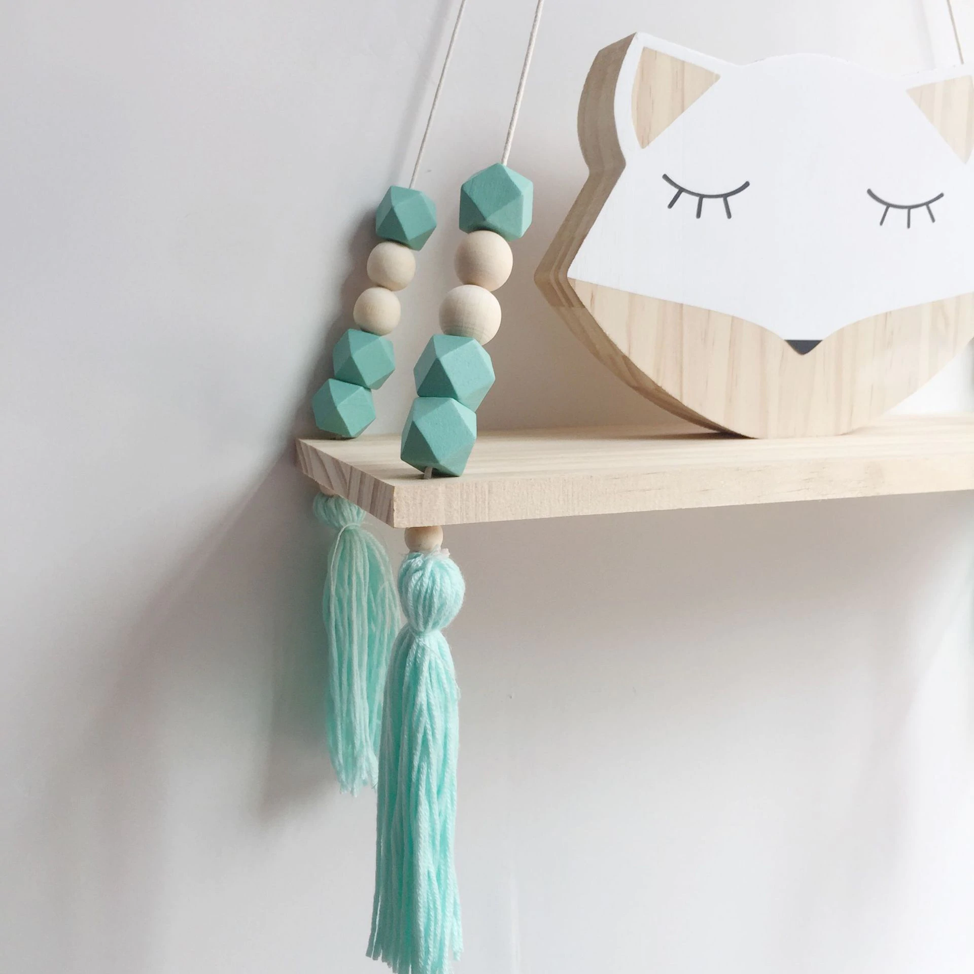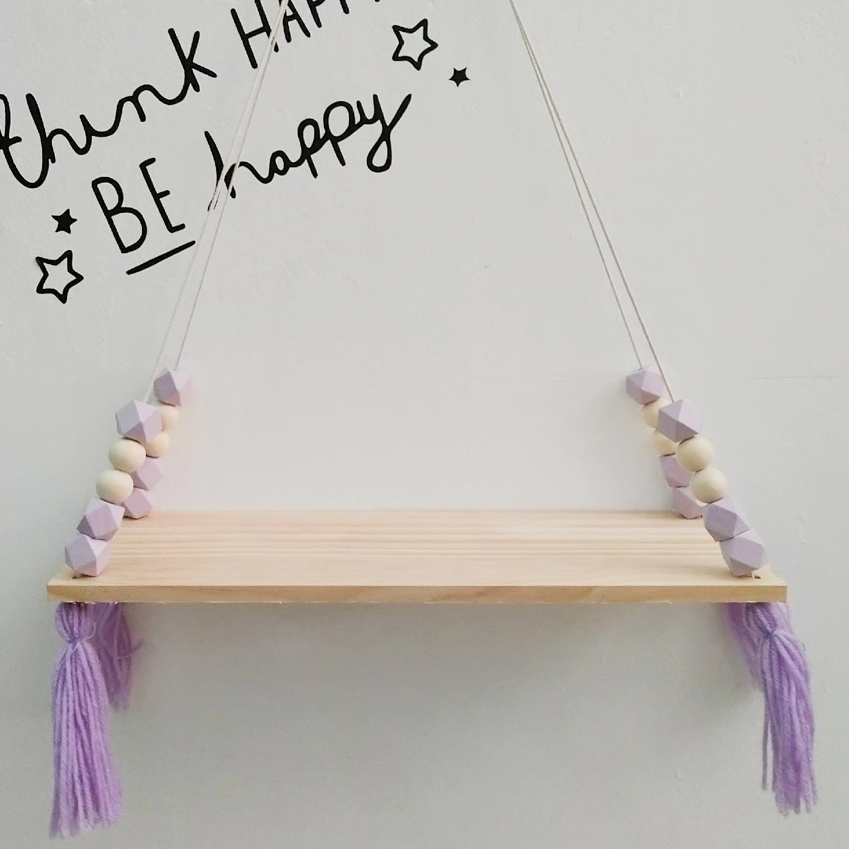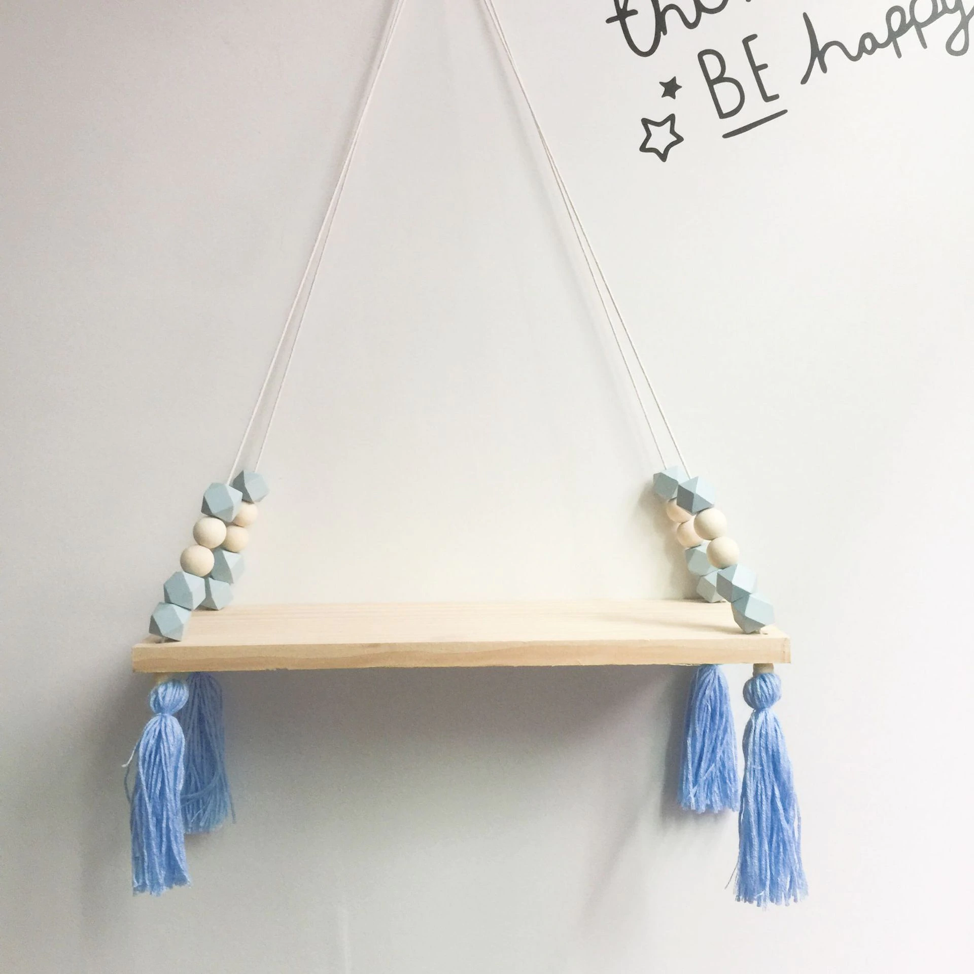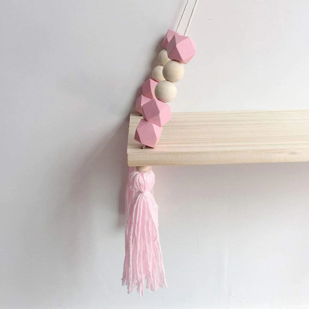 Features a natural wooden ledge threaded onto strong rope to hang from the wall. Complete with colourful beads and tassels.