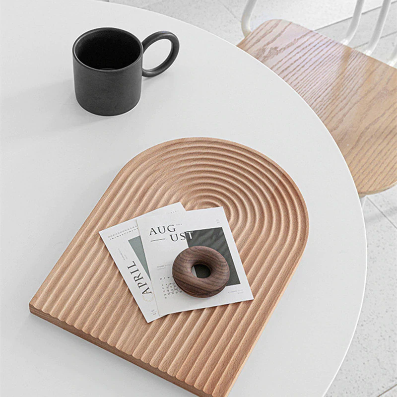 Nordic grooved wooden trays great for using to display perfumes and cosmetics on a vanity or as a table setting centerpiece. Featured in three different shapes, half circle, rectangle and squiggle. Timeless modern nordic design adding natural texture to any surface.