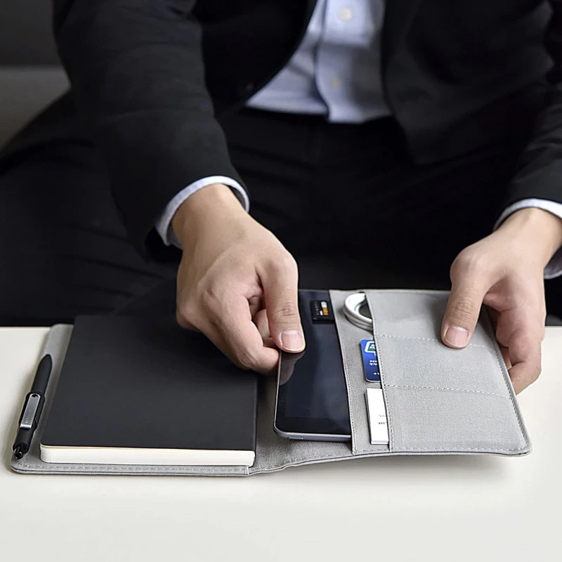 A wallet and notebook in one, keep your cards, money, and notepad in one place while you're on the move. With a pen included, quick note-taking is easy and efficient. There is a pocket large enough to fit a small tablet or smartphone, so your valuables are where they need to be when you need them quickly. The notepad includes ruled sheets, caged sheets and empty sheets.