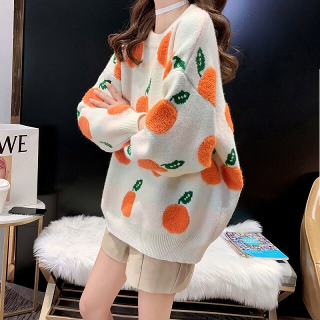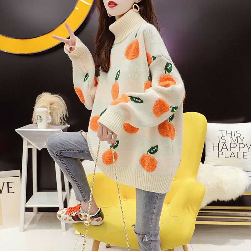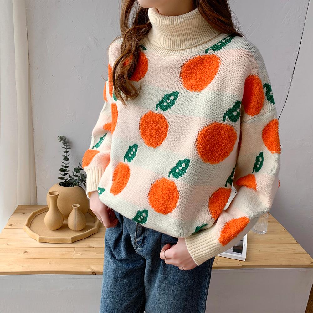 Wrap yourself up in warmth and comfort with this high neck sweater featuring a fun all over orange print.