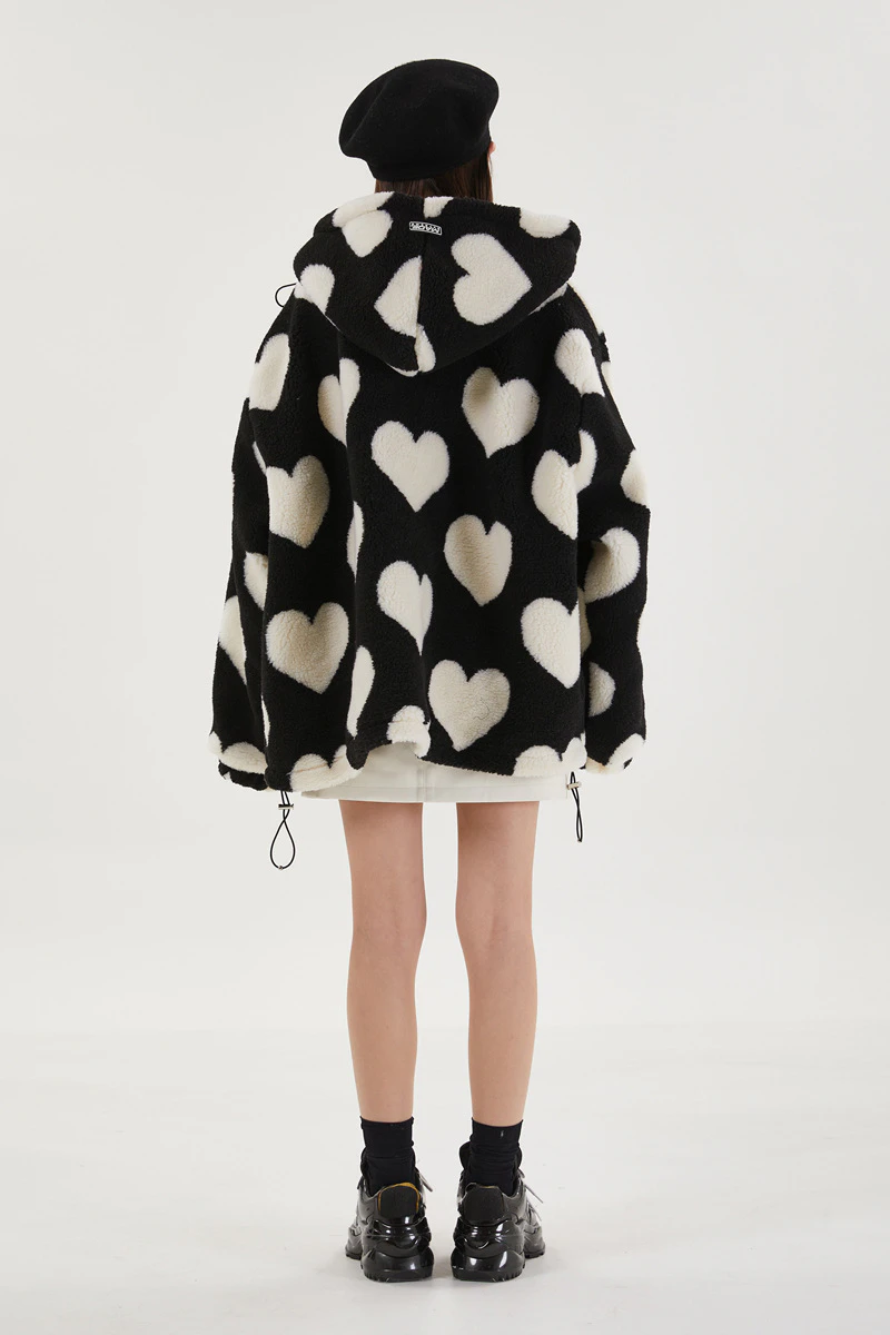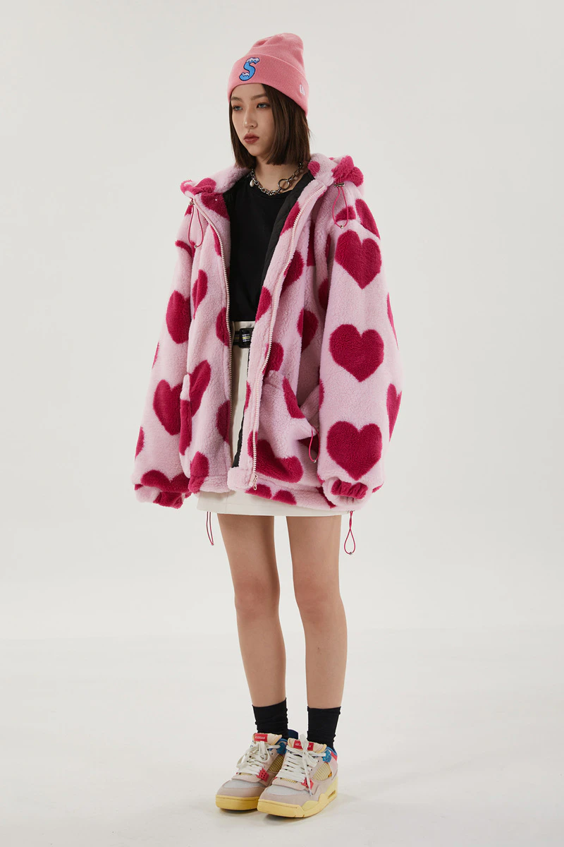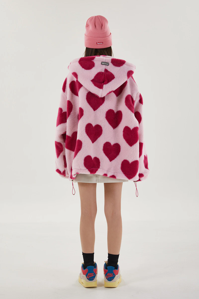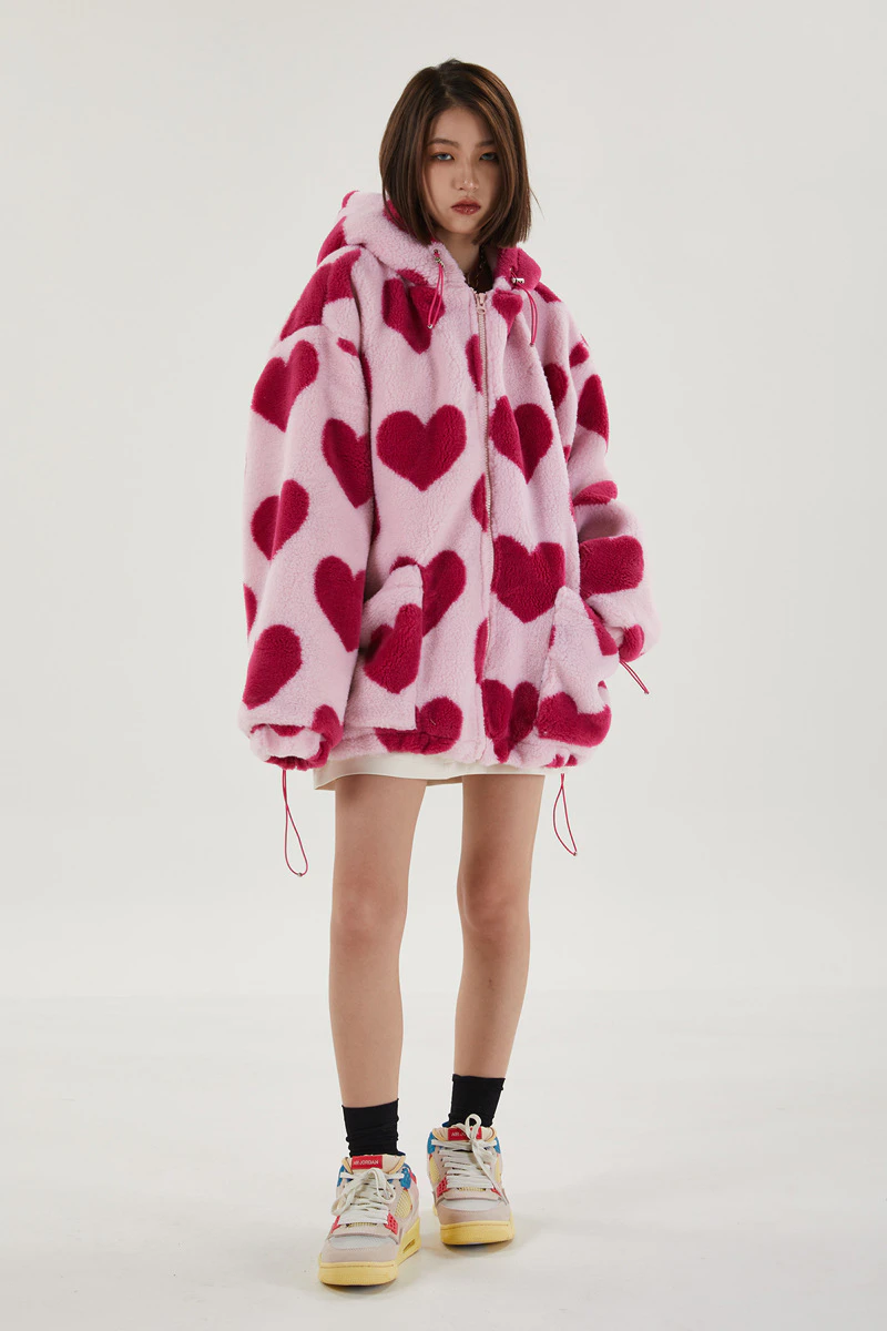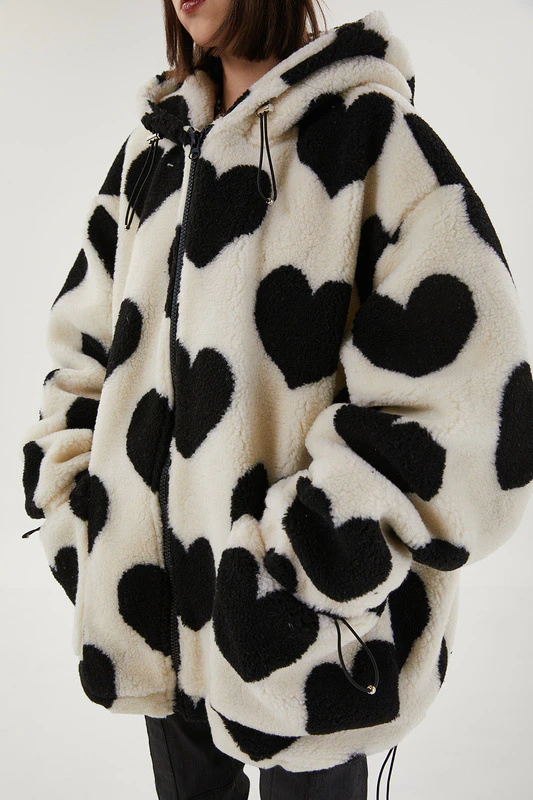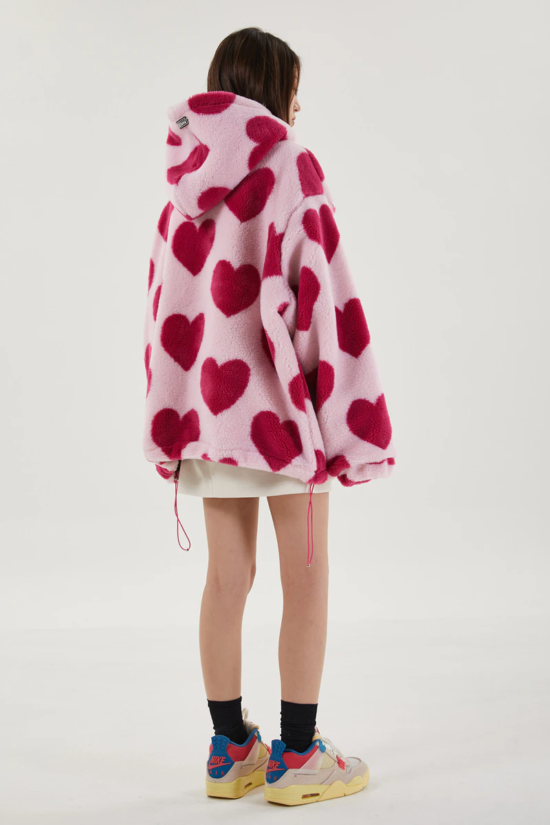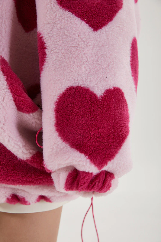 Style, comfort and warmth in one. This plush fleece jacket has it all; fluffy on both the outside and inside with drawstrings on the hood, wrists and bottom to lock in warmth, a zipper closure, large pockets and most importantly - an all over heart pattern that makes this jumper the ultimate addition to your winter wardrobe.