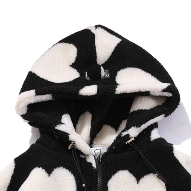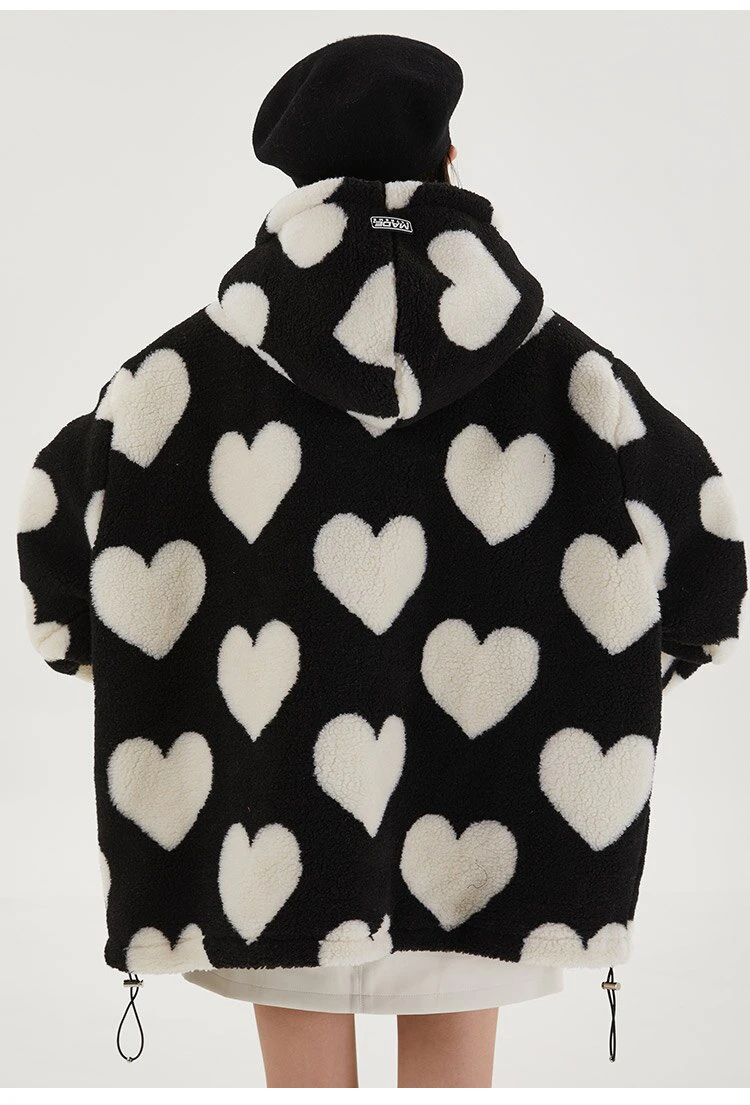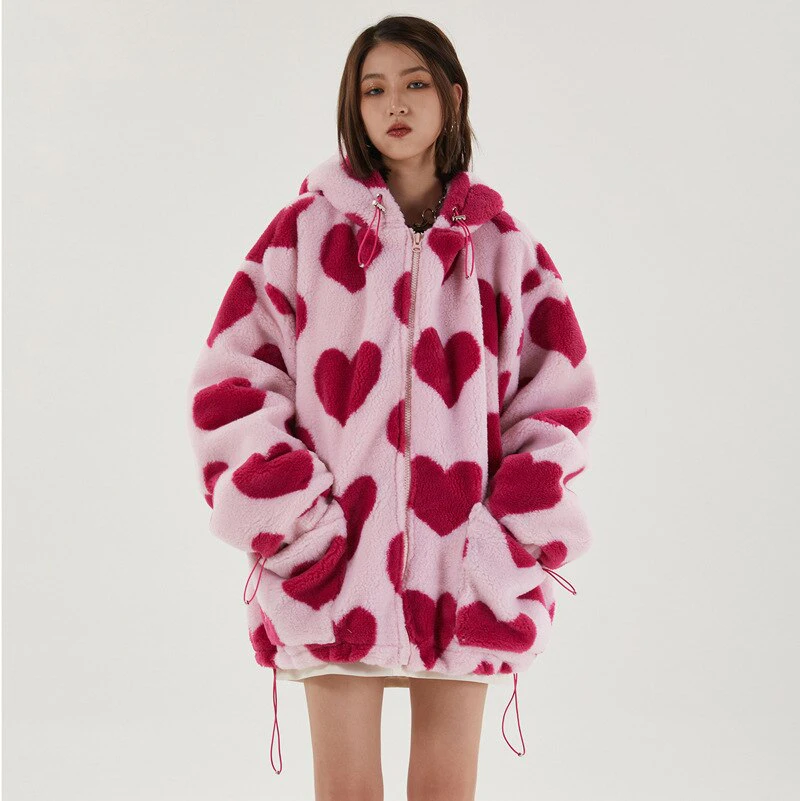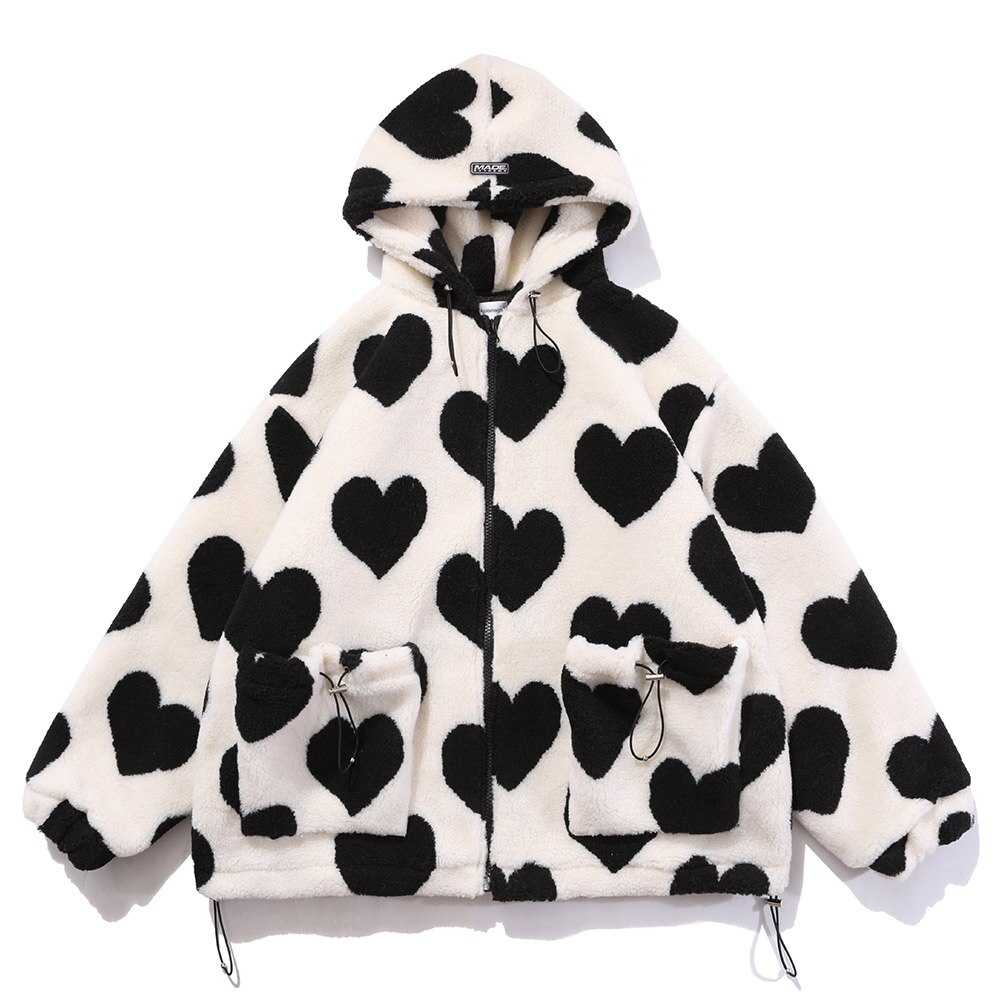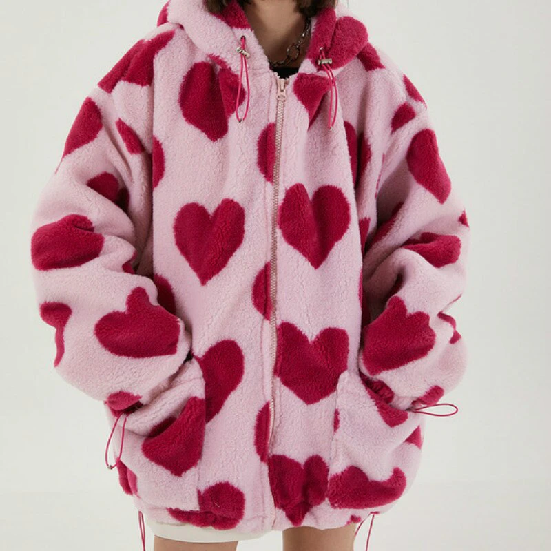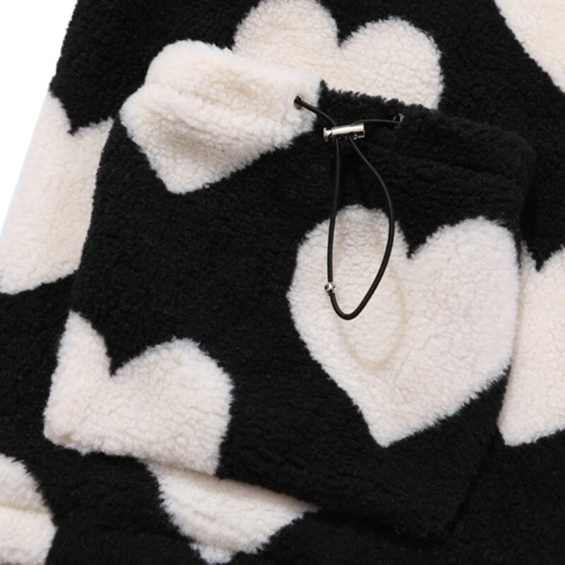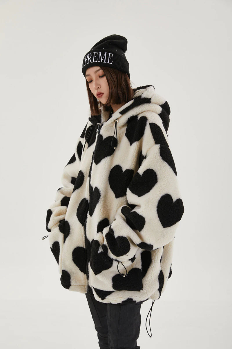 Style, comfort and warmth in one. This plush fleece jacket has it all; fluffy on both the outside and inside with drawstrings on the hood, wrists and bottom to lock in warmth, a zipper closure, large pockets and most importantly - an all over heart pattern that makes this jumper the ultimate addition to your winter wardrobe.