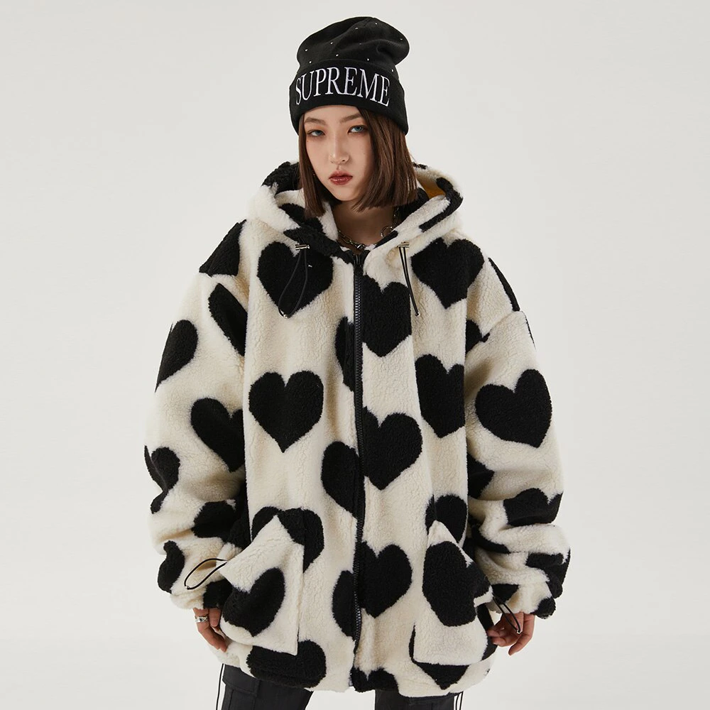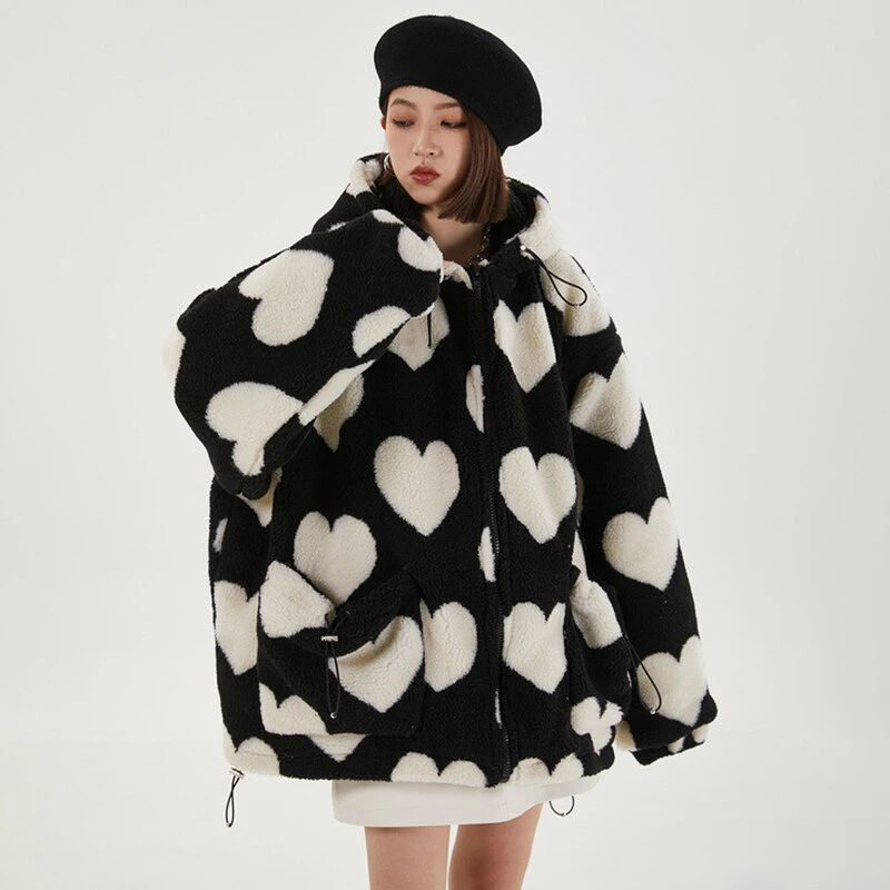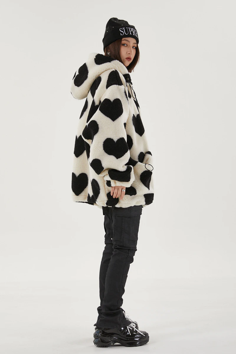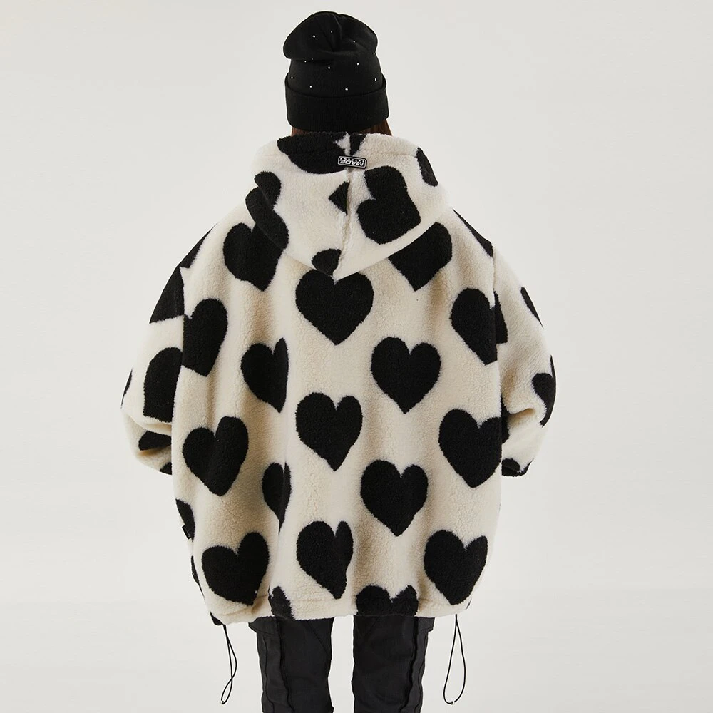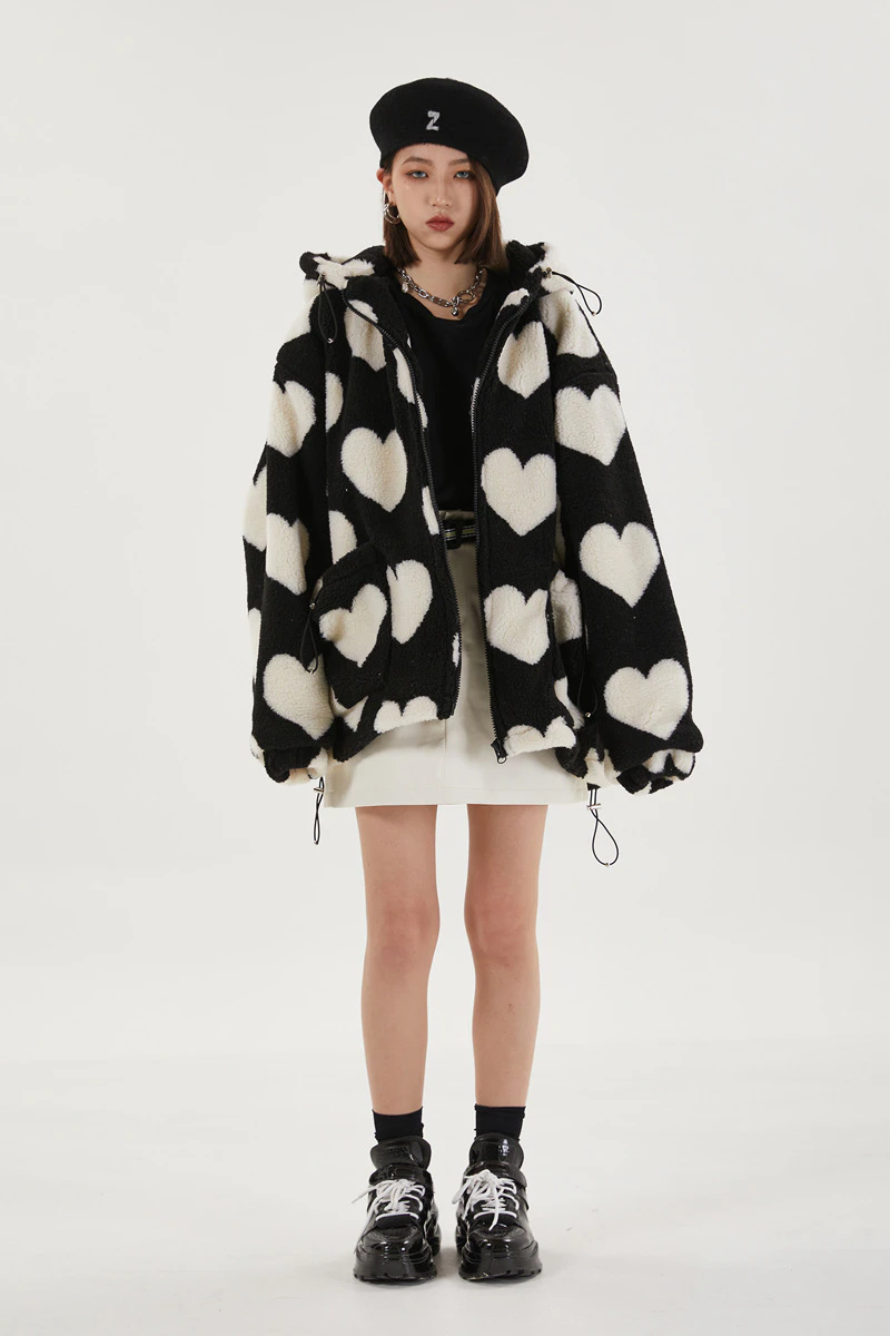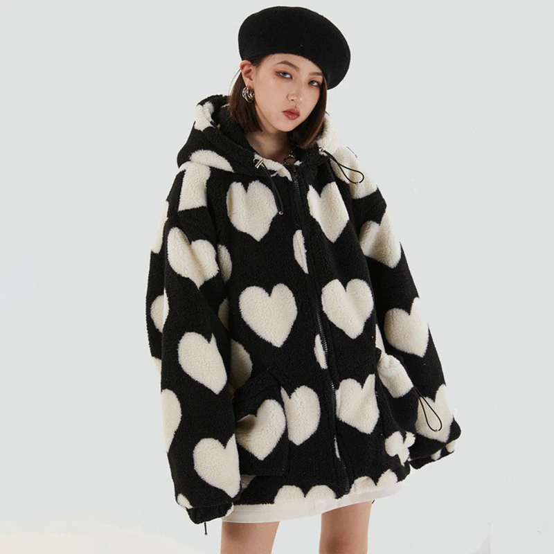 Style, comfort and warmth in one. This plush fleece jacket has it all; fluffy on both the outside and inside with drawstrings on the hood, wrists and bottom to lock in warmth, a zipper closure, large pockets and most importantly - an all over heart pattern that makes this jumper the ultimate addition to your winter wardrobe.