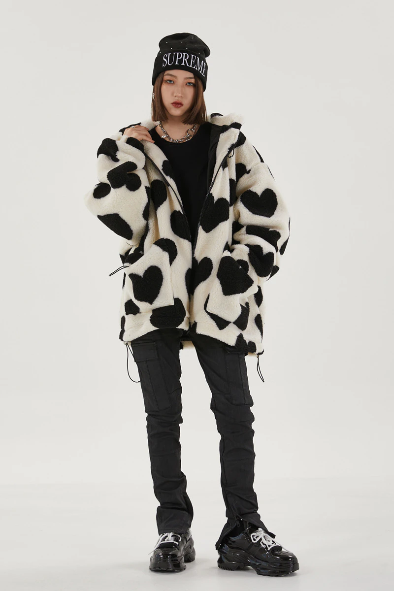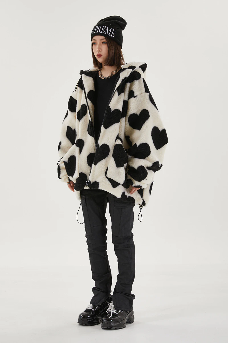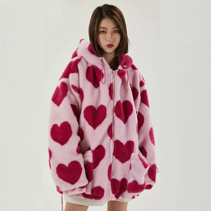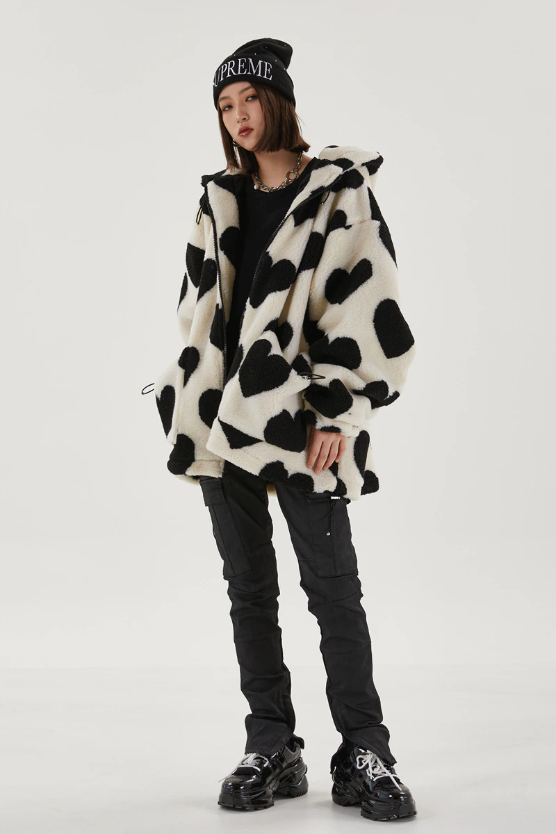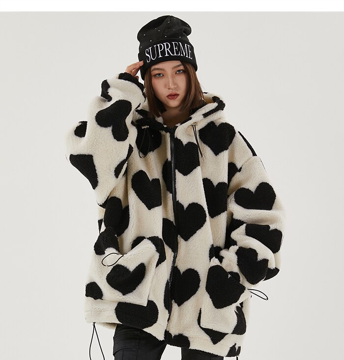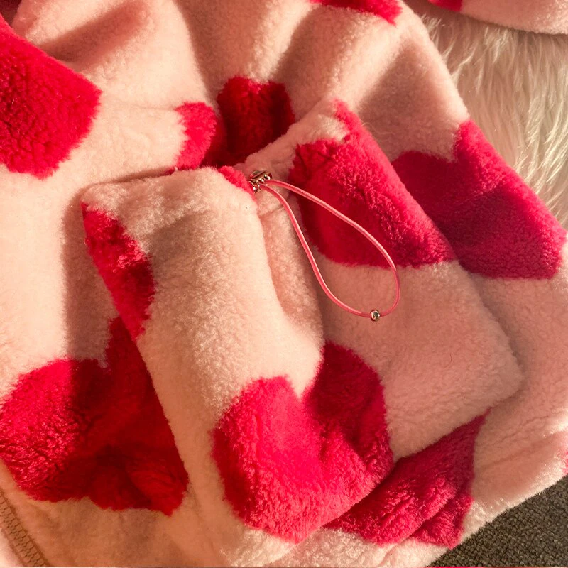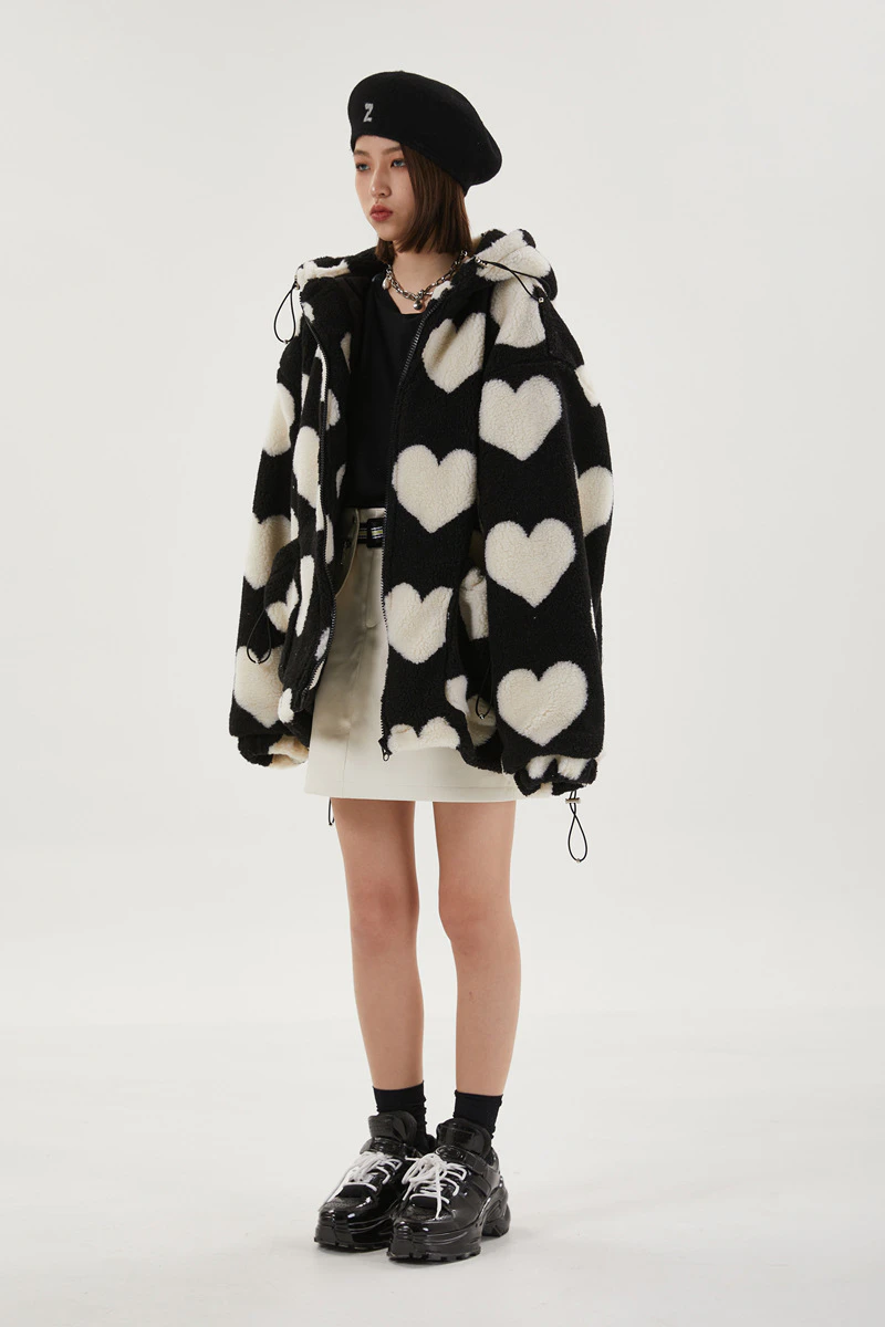 Style, comfort and warmth in one. This plush fleece jacket has it all; fluffy on both the outside and inside with drawstrings on the hood, wrists and bottom to lock in warmth, a zipper closure, large pockets and most importantly - an all over heart pattern that makes this jumper the ultimate addition to your winter wardrobe.