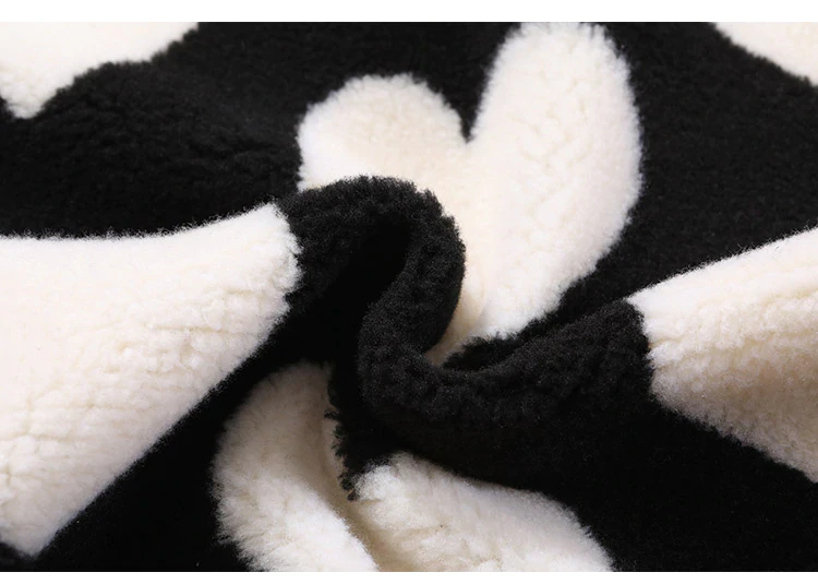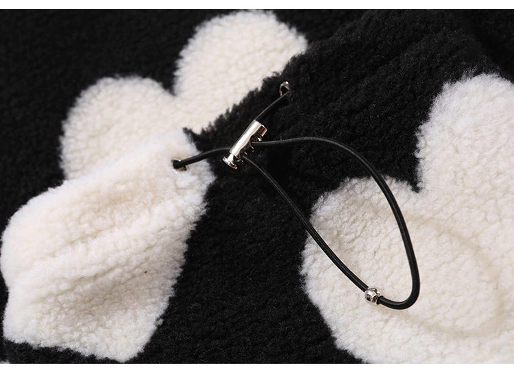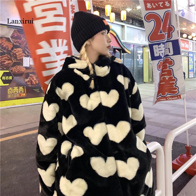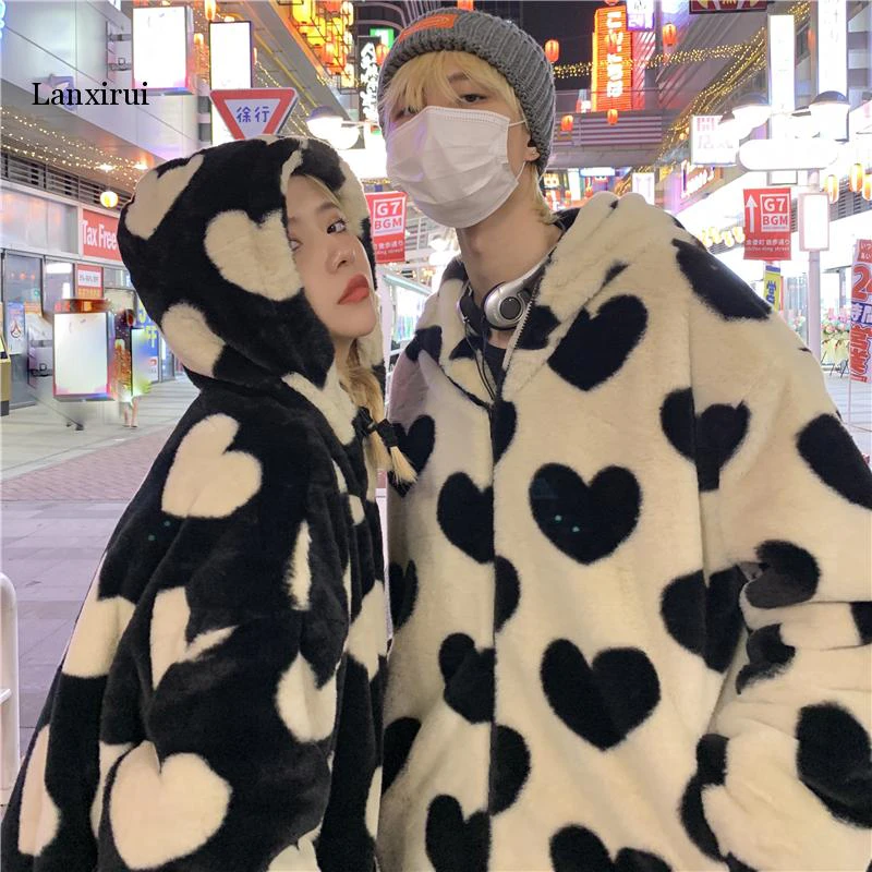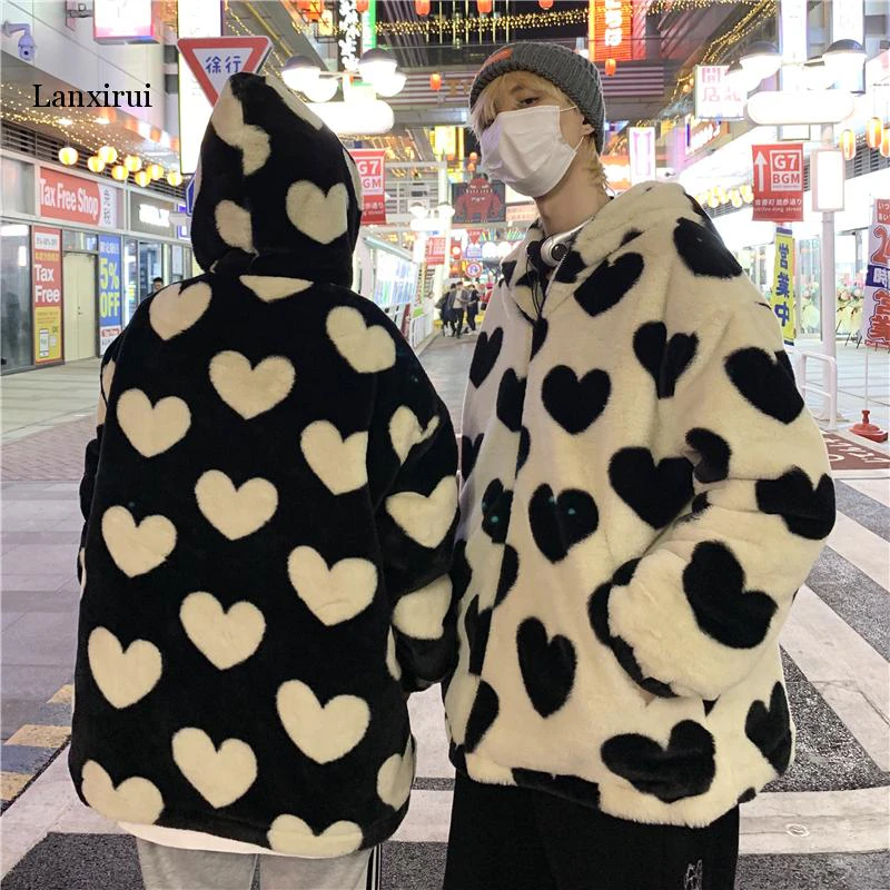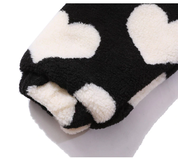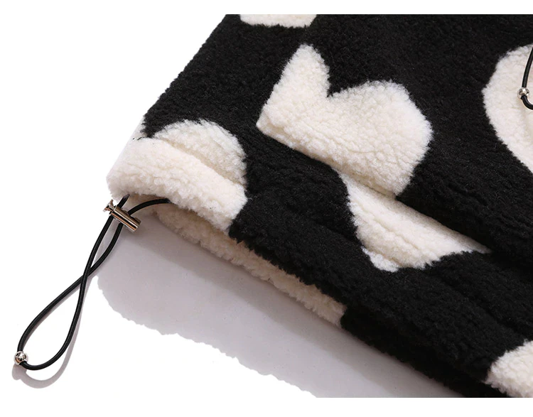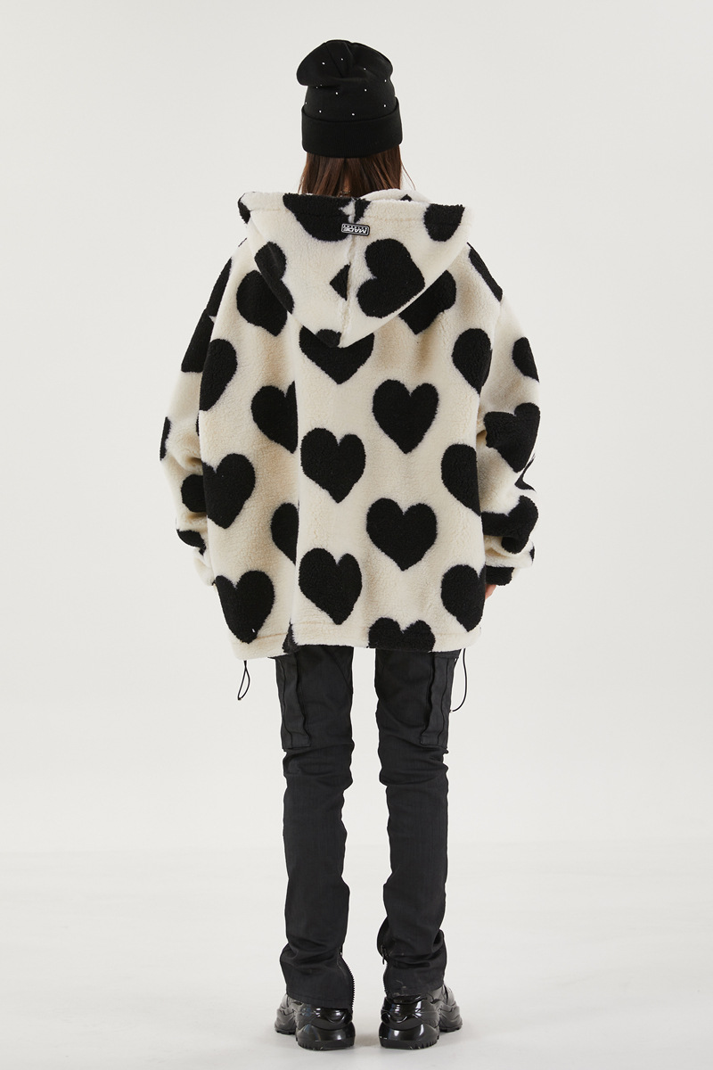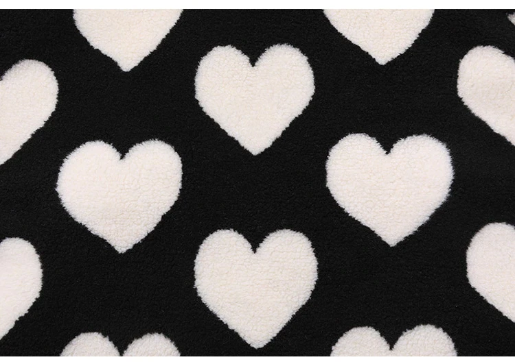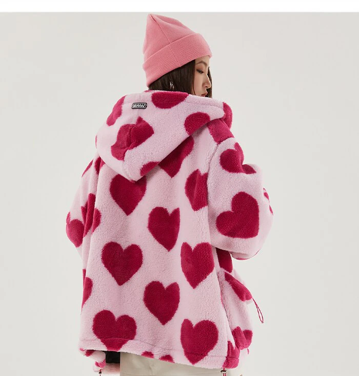 Style, comfort and warmth in one. This plush fleece jacket has it all; fluffy on both the outside and inside with drawstrings on the hood, wrists and bottom to lock in warmth, a zipper closure, large pockets and most importantly - an all over heart pattern that makes this jumper the ultimate addition to your winter wardrobe.