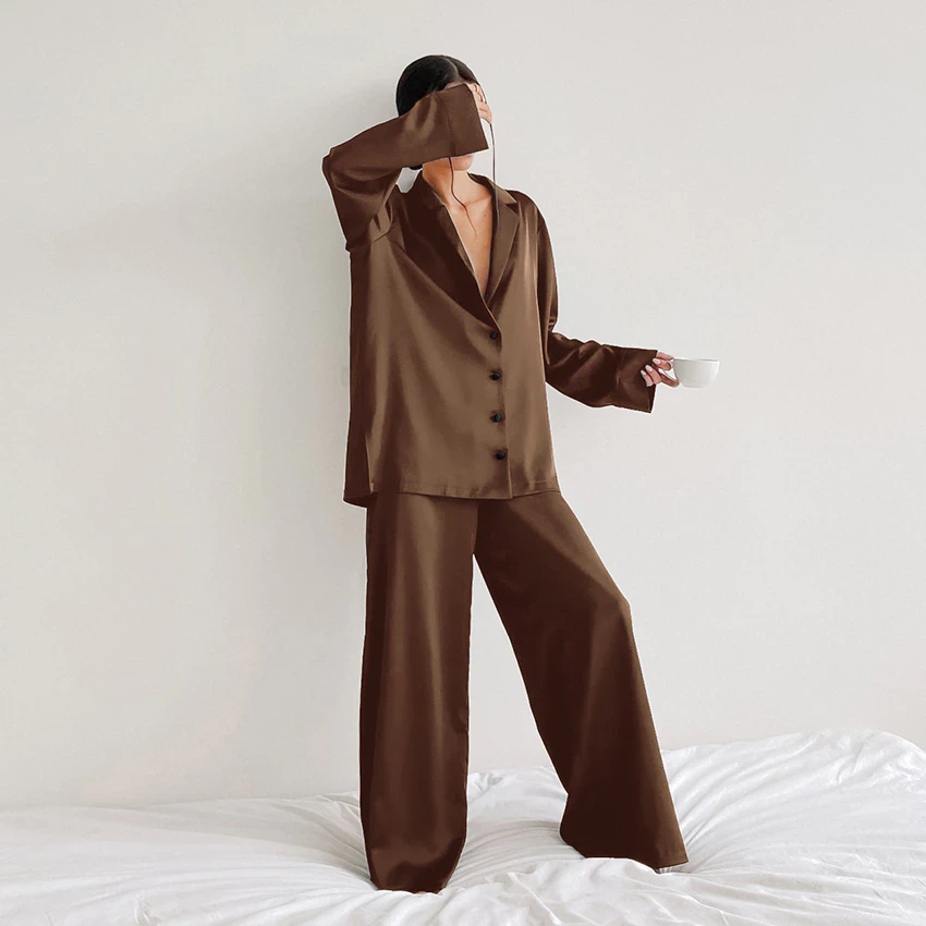 Made from a perfect blend of polyester and spandex, this pyjama set features a long sleeved button up shirt and oversized relaxed pants. Lightweight and breathable, you'll want to lounge in these all day. Available in a range of beautiful colours so you can have a pair for each day of the week.