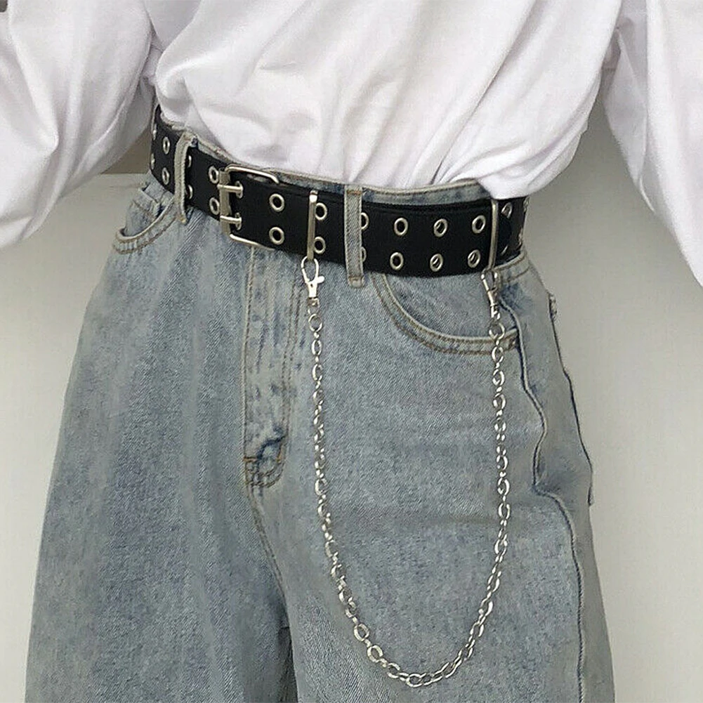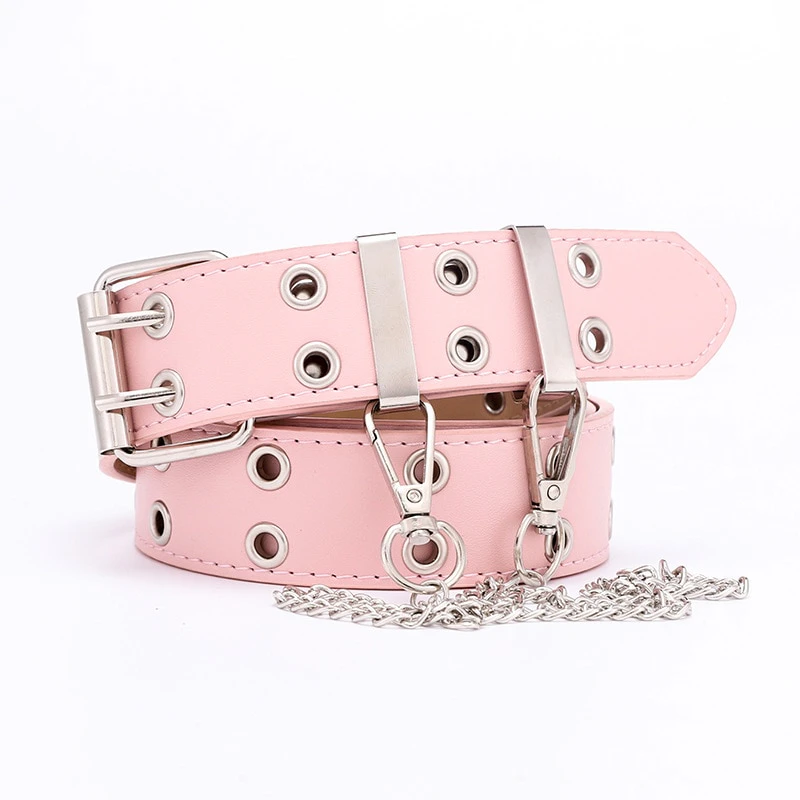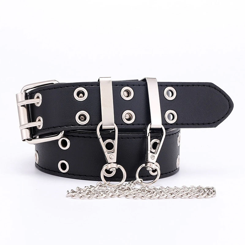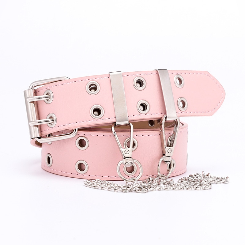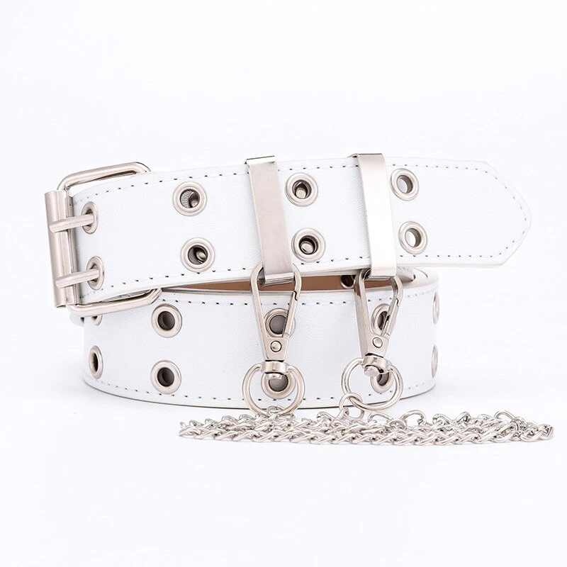 Give your outfits a touch of punk with this belt adorned with steel grommets and an attached chain, complete with a double pronged square buckle. Available in 6 different colours.