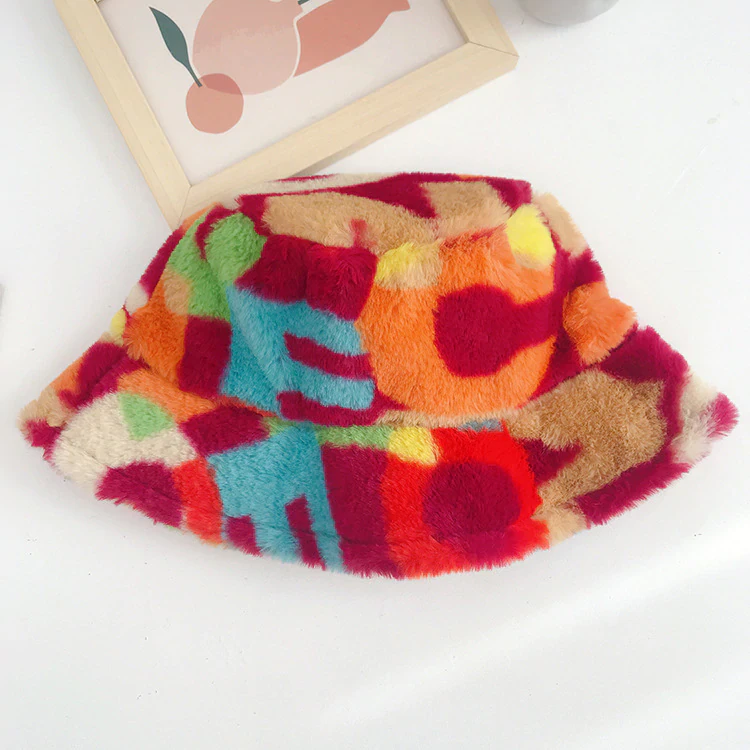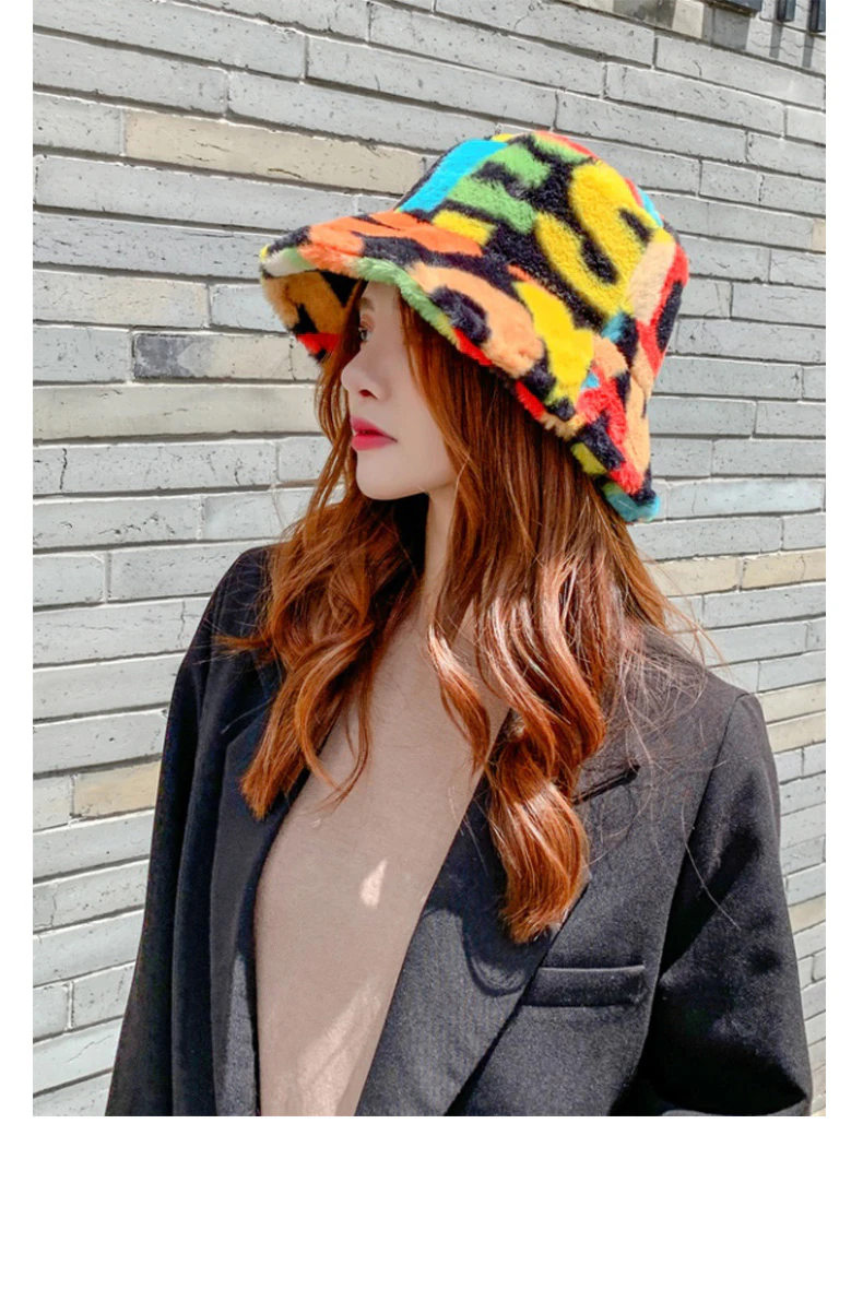 Accessorise in style and keep your head warm in this colourful faux fur bucket hat.