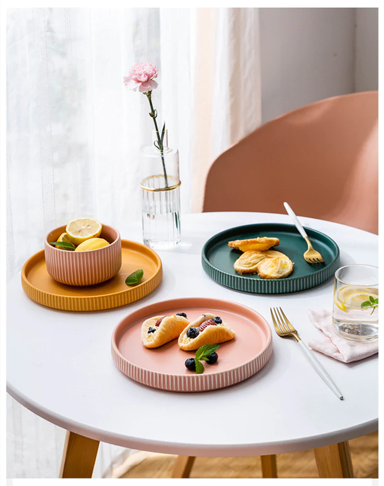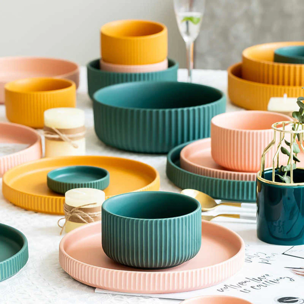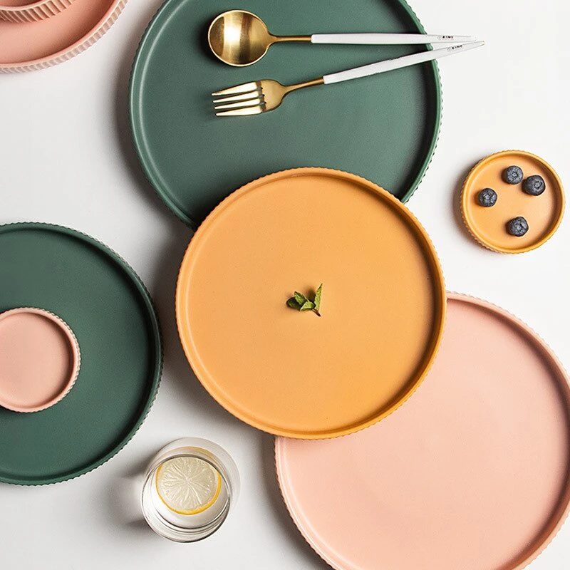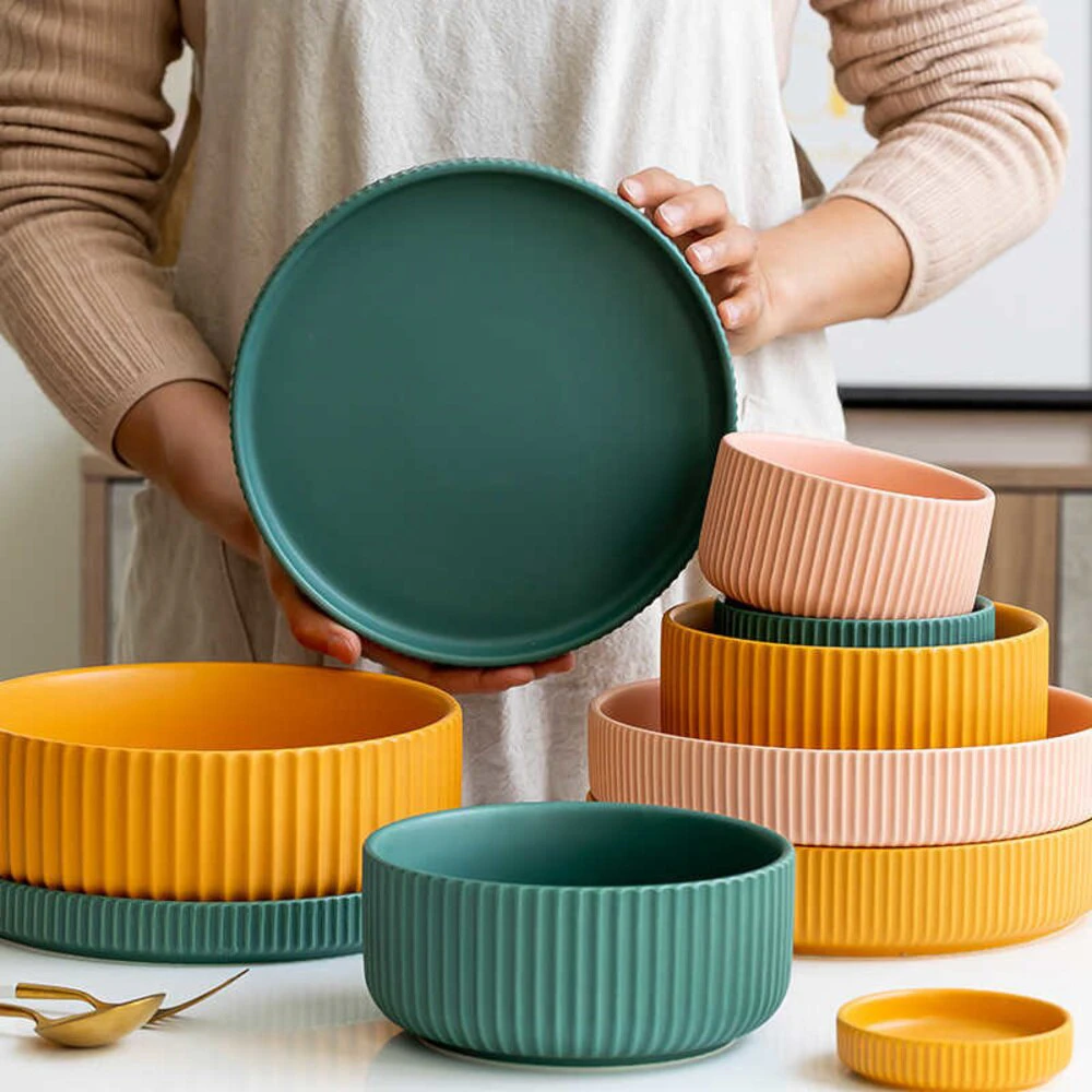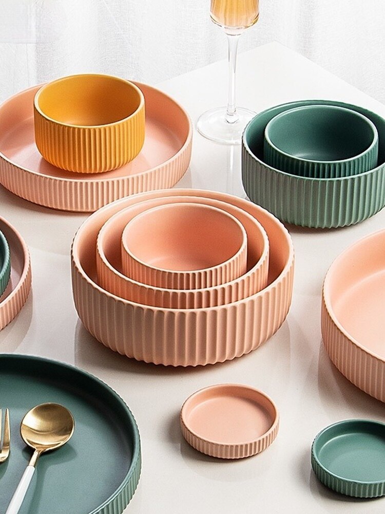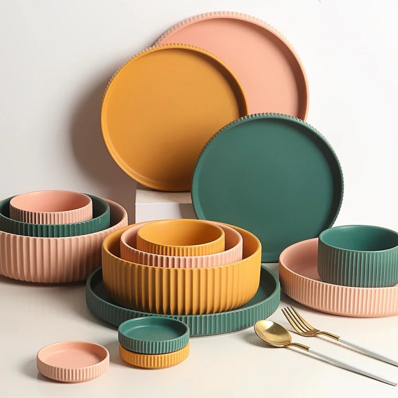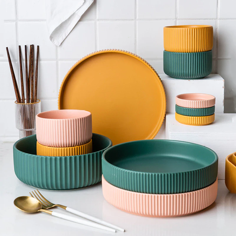 This ribbed edge serveware comes in dark green, mustard, or dusty rose colours. Give your kitchen a pop of colour with these bowls and plates that are available in a range of sizes.