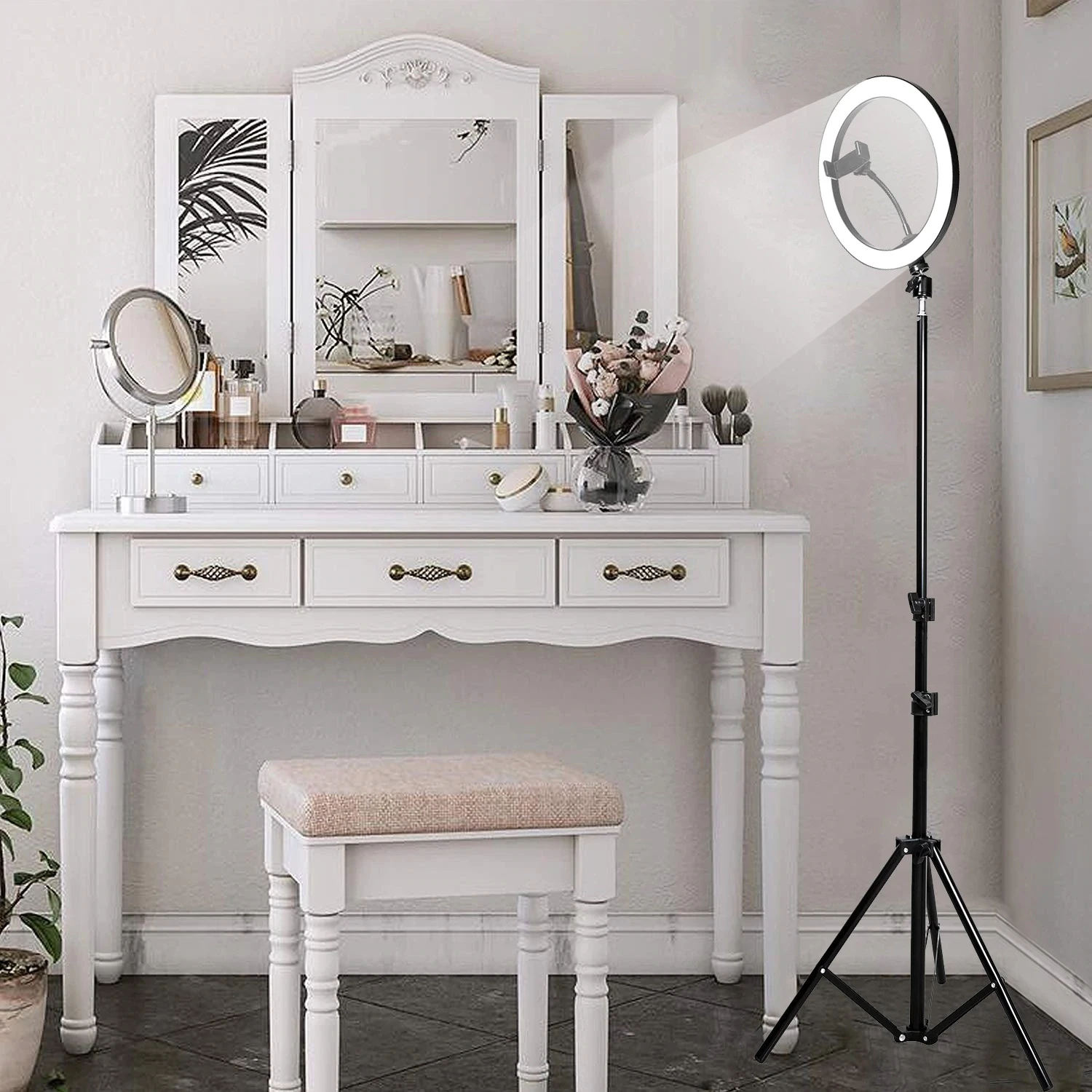 Get the right lighting every time with this ring lamp tripod setup. Place your phone in the middle of the ring lamp for studio level lighting for perfect selfies and videos. Great for amateur and professionals photographers and content creators alike.