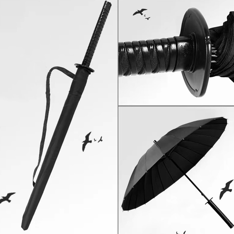 Inspired by Japanese katanas, this strong black umbrella is made with a durable steel frame and includes a sheath and back-strap that allows for rapid deployment over your shoulder.