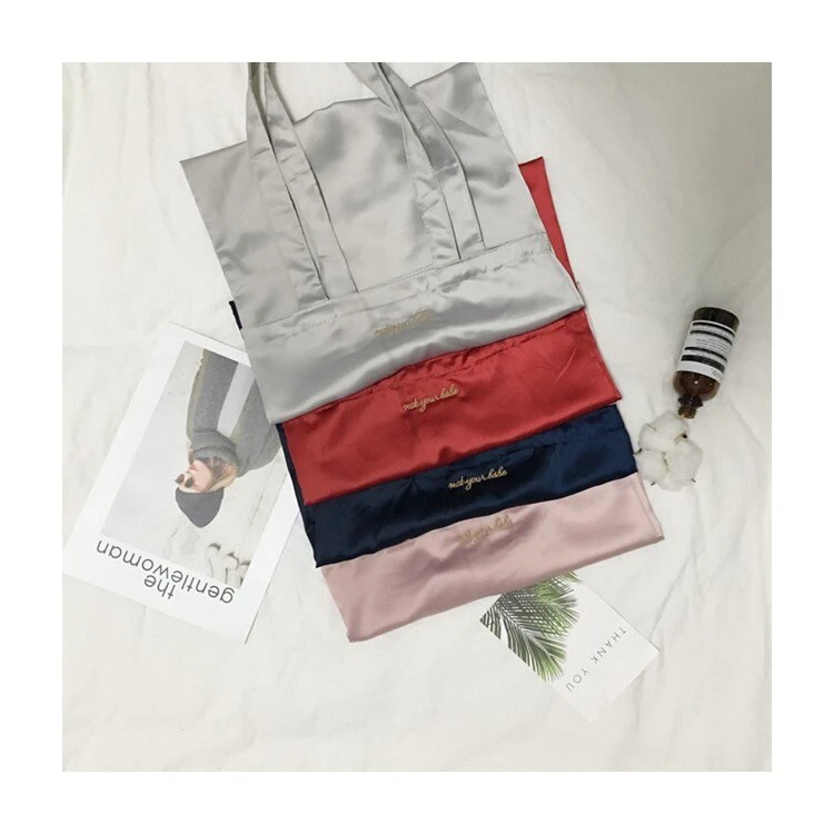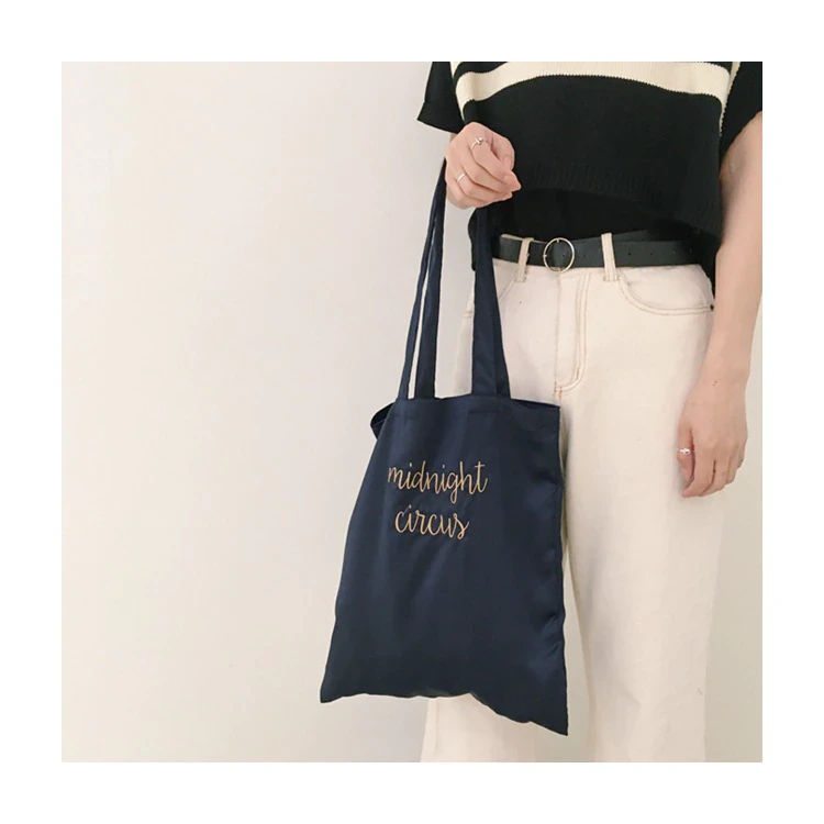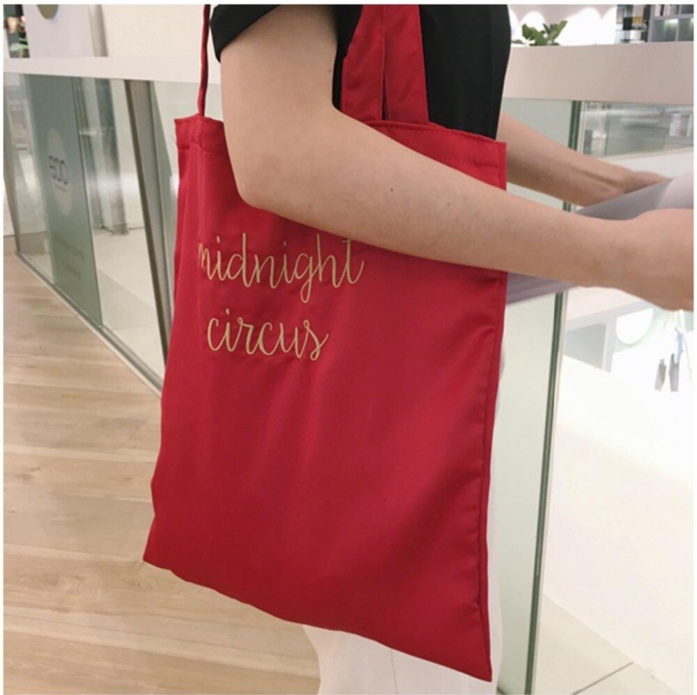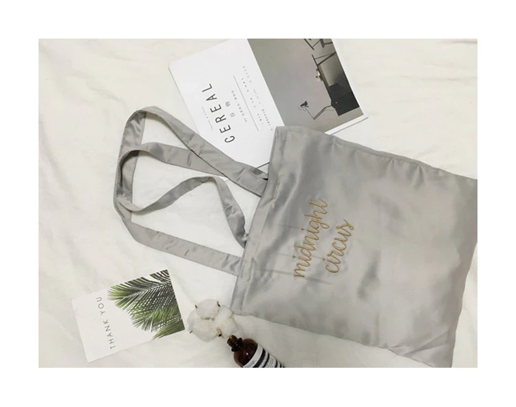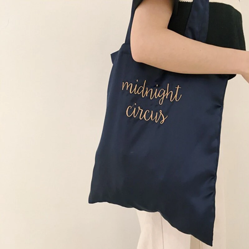 This silk inspired tote bag features an embroidered "midnight circus", shoulder straps for easy carrying, and is available in a range of colours.