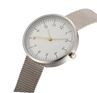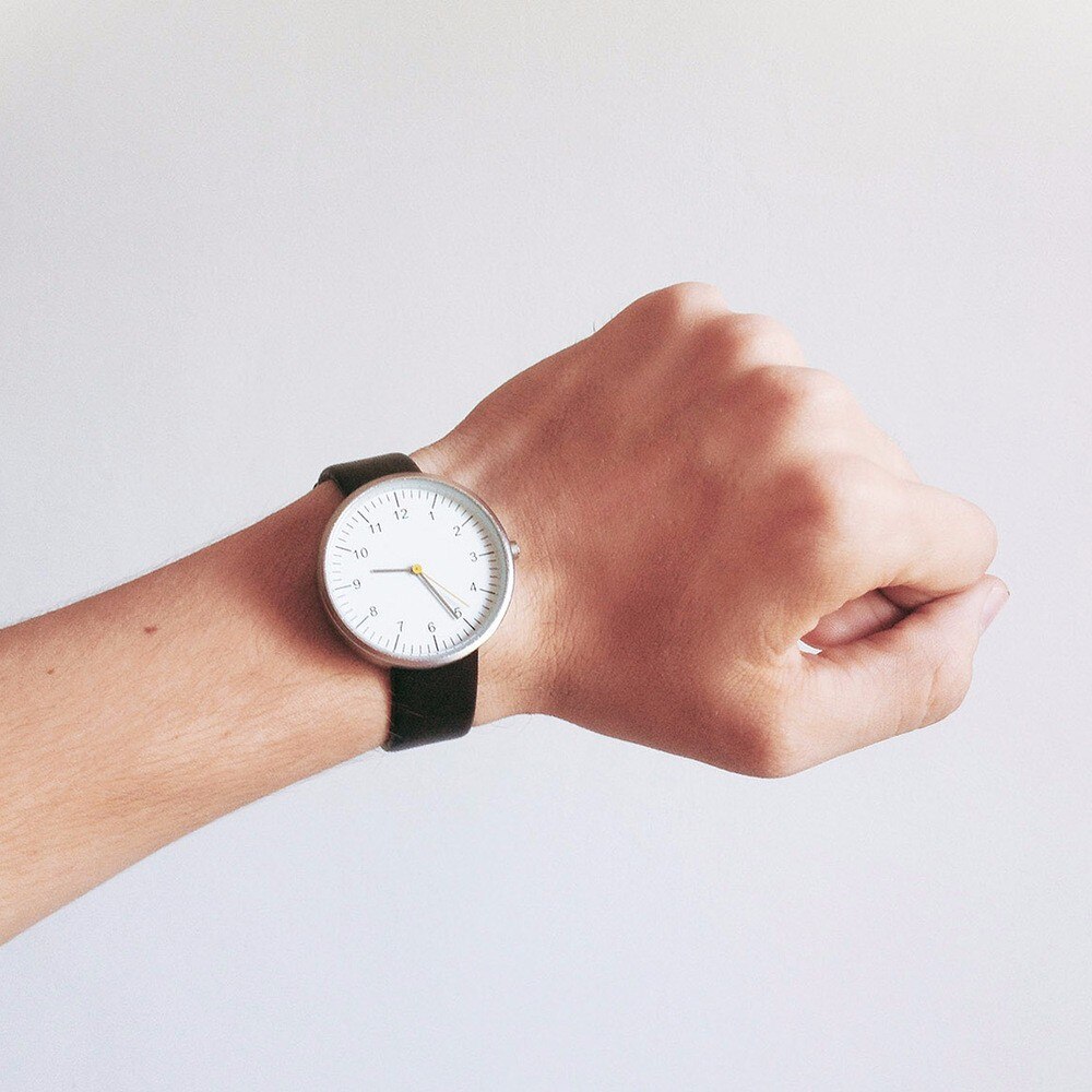This simplistic silver-cased watch makes checking if it's time for a lunch break that much more exciting! With a genuine leather band and a chic yellow second hand, this watch is a perfect addition to any jewelry collection.