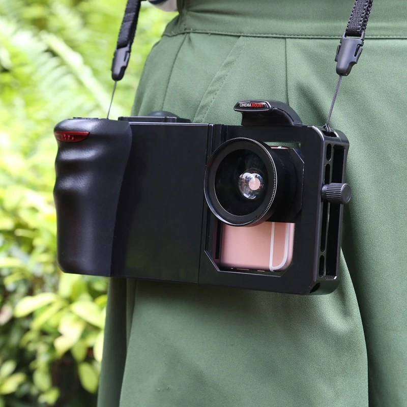 Capture and create stunning video content with ease using our Smartphone Video Mount. With universal compatibility, this mount fits any smartphone model and allows you to take control with the Bluetooth shutter control. Designed to resemble an SLR camera, this mount is easy and comfortable to handle, while the super wide-angle lens and macro lens allow for amazing shots. And with the included carry strap, you can take this mount with you wherever you go, ready to capture every moment.